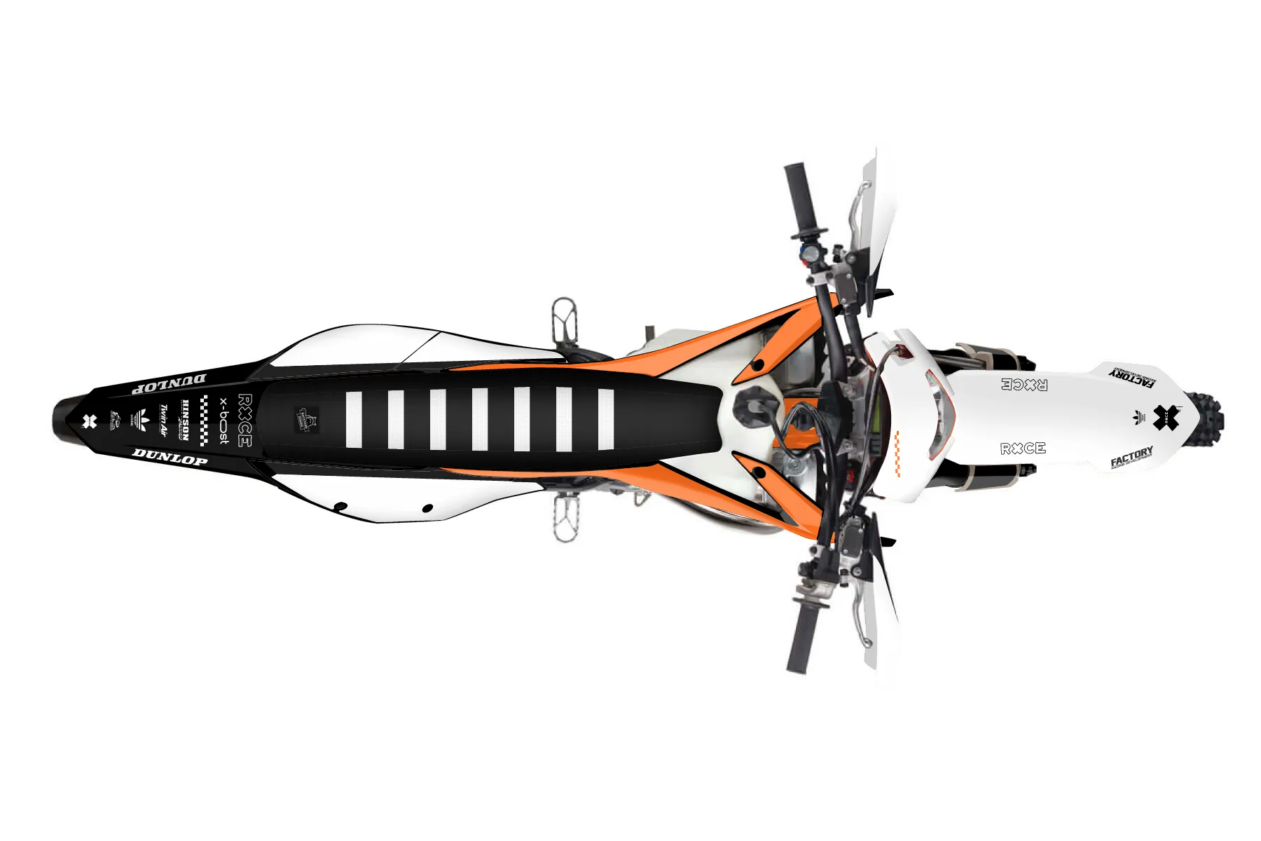 «Covering» — готовый комплект графики серии Staple для KTM Enduro Graphic Kit KTM EXC 150 2020. В комплекте: графика на бак и боковые облицовки, крылья (переднее и заднее), передний щиток, номерные таблички, защита вилки. Материал: ПВХ-винил 80 мкр с холодной ламинацией 300 мкр, общая толщина 380 мкр; покрытие глянцевое или матовое на выбор. Устойчив к UV-излучению, воде, бензину и мойке высокого давления. Клей акриловый на сольвентной основе — постоянный, для гибких пластиков. На простых поверхностях монтируется без нагрева; для сложных изгибов рекомендуем фен. Этот пресет можно заказать как есть или взять за основу в конструкторе: поменять цвета, добавить стартовый номер и свой бренд. Производство — 3–5 рабочих дней, доставка по России СДЭКом или Почтой, по СНГ — курьерскими службами.