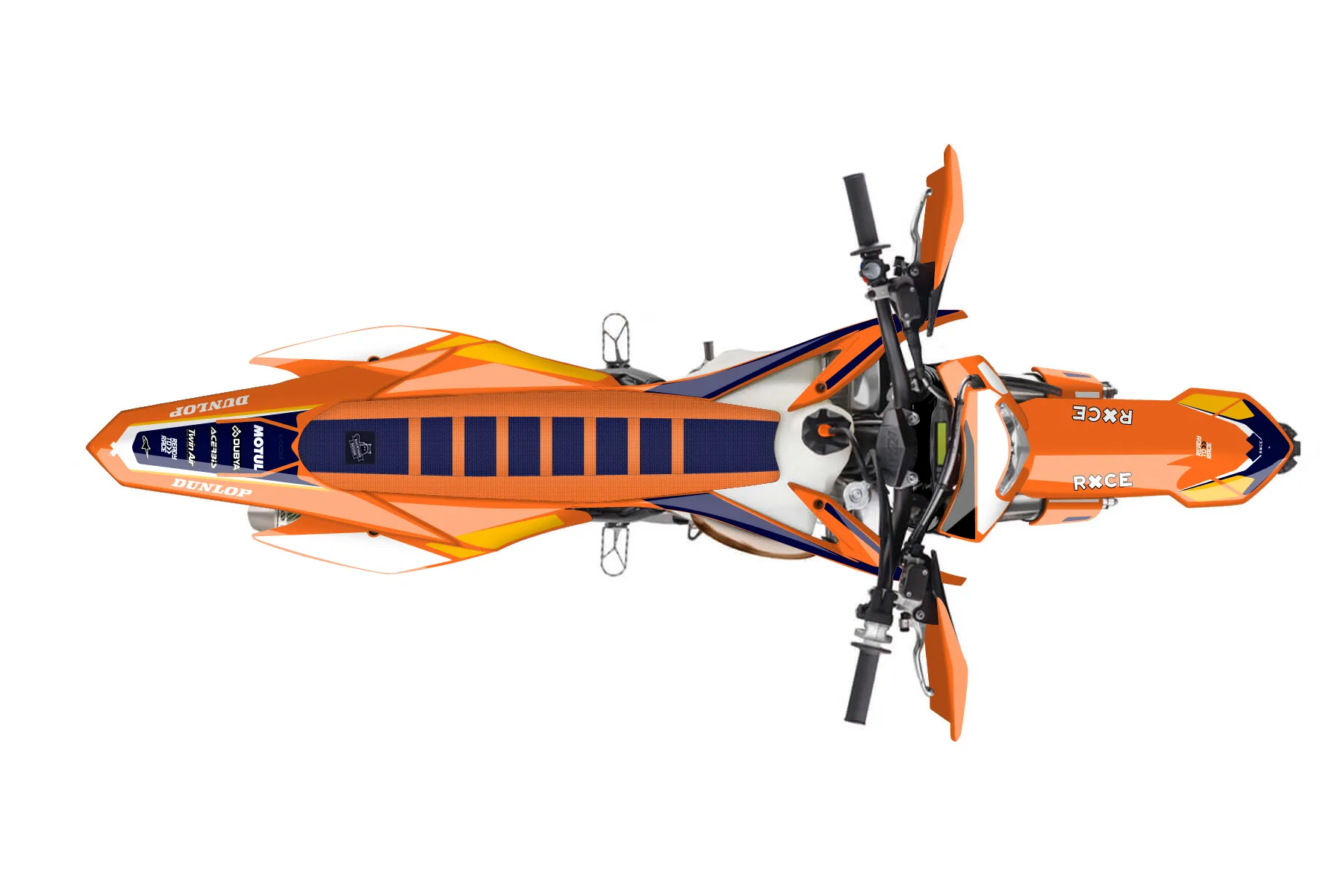 «Pixel» — готовый комплект графики серии Flow для KTM Enduro Graphic Kit KTM EXC 250 2014. В комплекте: графика на бак и боковые облицовки, крылья (переднее и заднее), передний щиток, номерные таблички, защита вилки. Материал: ПВХ-винил 80 мкр с холодной ламинацией 300 мкр, общая толщина 380 мкр; покрытие глянцевое или матовое на выбор. Устойчив к UV-излучению, воде, бензину и мойке высокого давления. Клей акриловый на сольвентной основе — постоянный, для гибких пластиков. На простых поверхностях монтируется без нагрева; для сложных изгибов рекомендуем фен. Этот пресет можно заказать как есть или взять за основу в конструкторе: поменять цвета, добавить стартовый номер и свой бренд. Производство — 3–5 рабочих дней, доставка по России СДЭКом или Почтой, по СНГ — курьерскими службами.