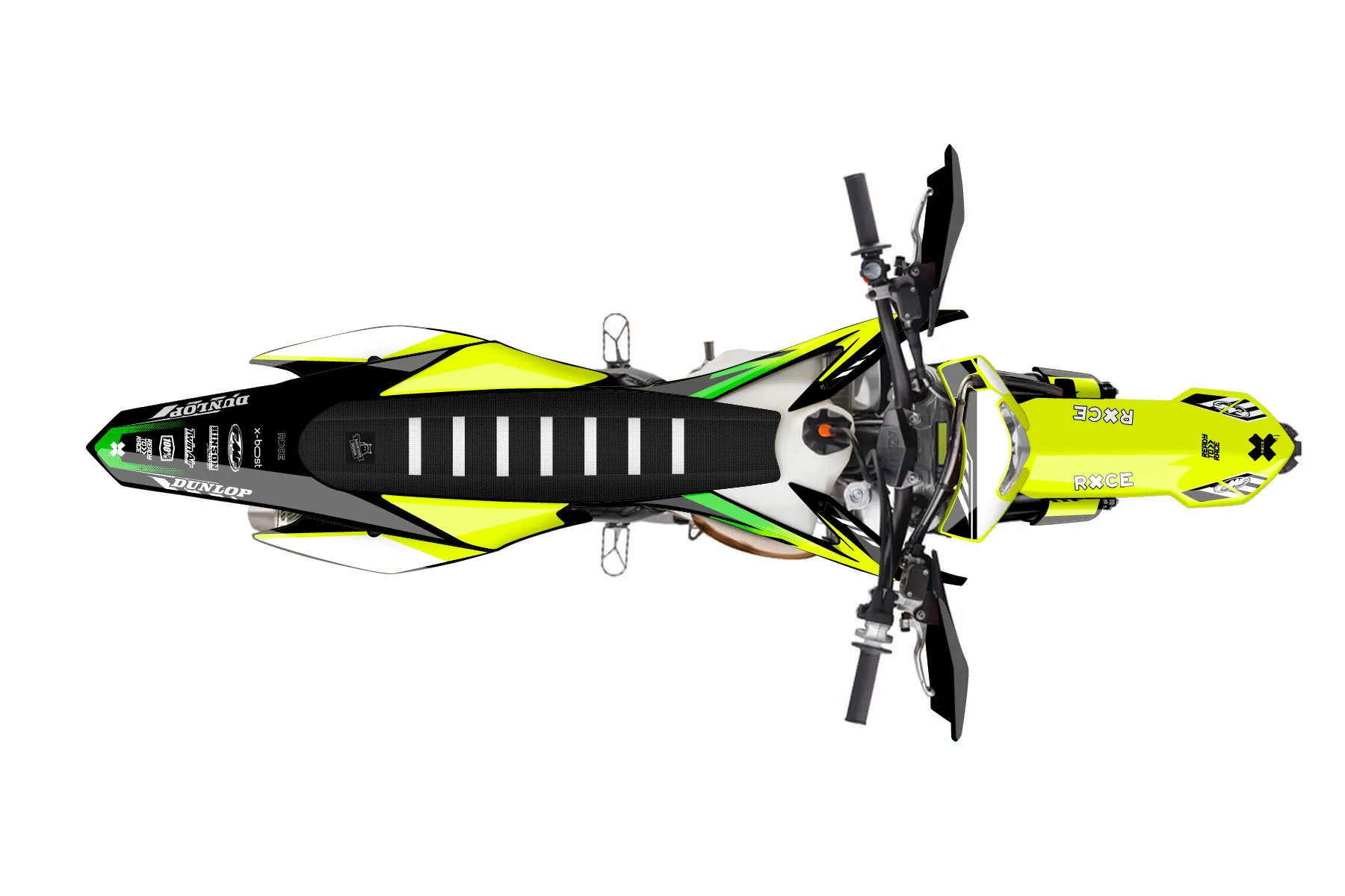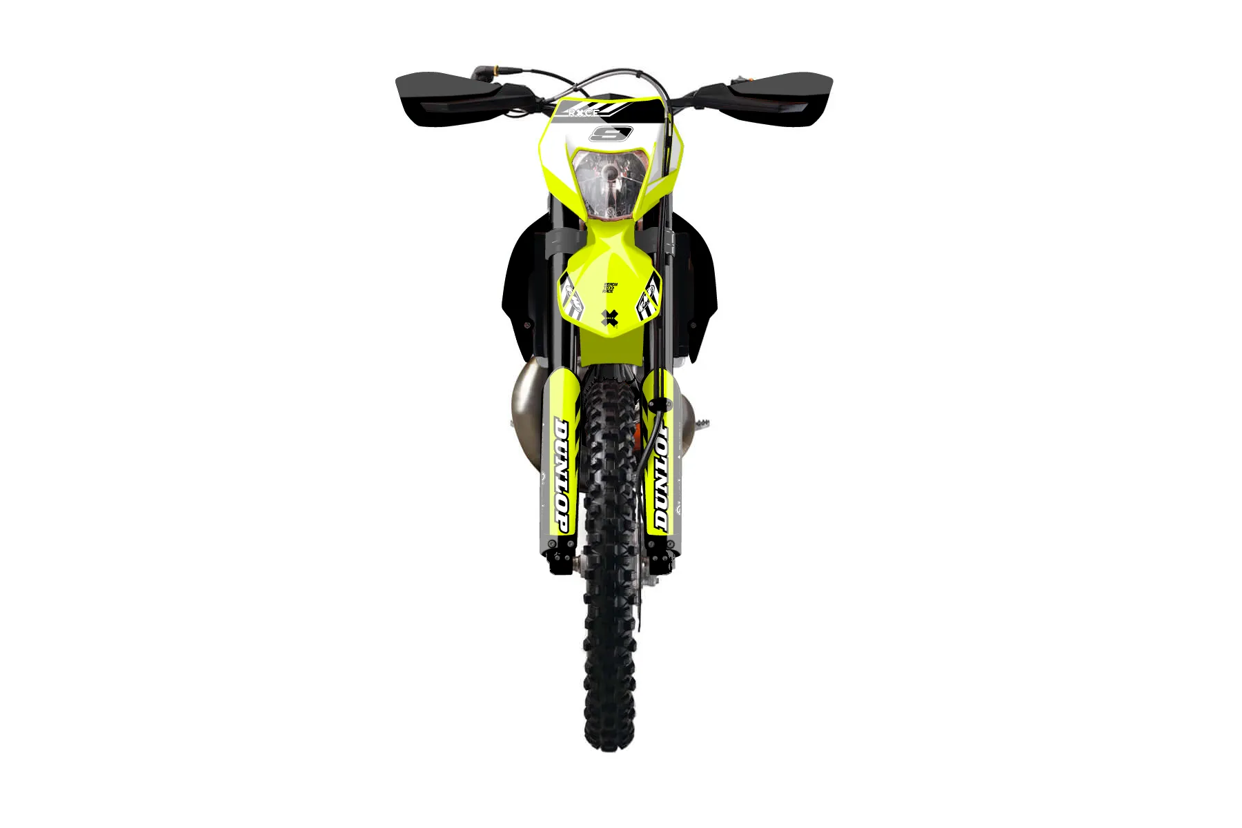 «Volt Neon» — готовый комплект графики серии Maverick для KTM Enduro Graphic Kit KTM EXC 250 2014. В комплекте: графика на бак и боковые облицовки, крылья (переднее и заднее), передний щиток, номерные таблички, защита вилки. Материал: ПВХ-винил 80 мкр с холодной ламинацией 300 мкр, общая толщина 380 мкр; покрытие глянцевое или матовое на выбор. Устойчив к UV-излучению, воде, бензину и мойке высокого давления. Клей акриловый на сольвентной основе — постоянный, для гибких пластиков. На простых поверхностях монтируется без нагрева; для сложных изгибов рекомендуем фен. Этот пресет можно заказать как есть или взять за основу в конструкторе: поменять цвета, добавить стартовый номер и свой бренд. Производство — 3–5 рабочих дней, доставка по России СДЭКом или Почтой, по СНГ — курьерскими службами.