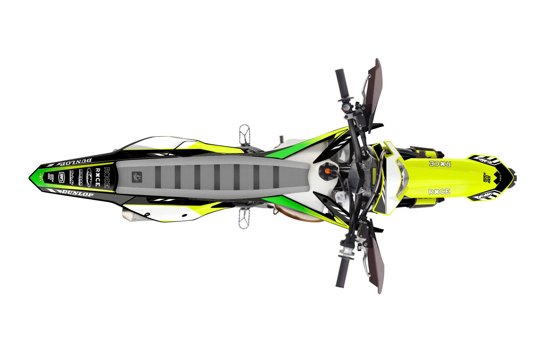 «Volt Neon» — готовый комплект графики серии Maverick для KTM Enduro Graphic Kit KTM EXC 250 2017. В комплекте: графика на бак и боковые облицовки, крылья (переднее и заднее), передний щиток, номерные таблички, защита вилки. Материал: ПВХ-винил 80 мкр с холодной ламинацией 300 мкр, общая толщина 380 мкр; покрытие глянцевое или матовое на выбор. Устойчив к UV-излучению, воде, бензину и мойке высокого давления. Клей акриловый на сольвентной основе — постоянный, для гибких пластиков. На простых поверхностях монтируется без нагрева; для сложных изгибов рекомендуем фен. Этот пресет можно заказать как есть или взять за основу в конструкторе: поменять цвета, добавить стартовый номер и свой бренд. Производство — 3–5 рабочих дней, доставка по России СДЭКом или Почтой, по СНГ — курьерскими службами.