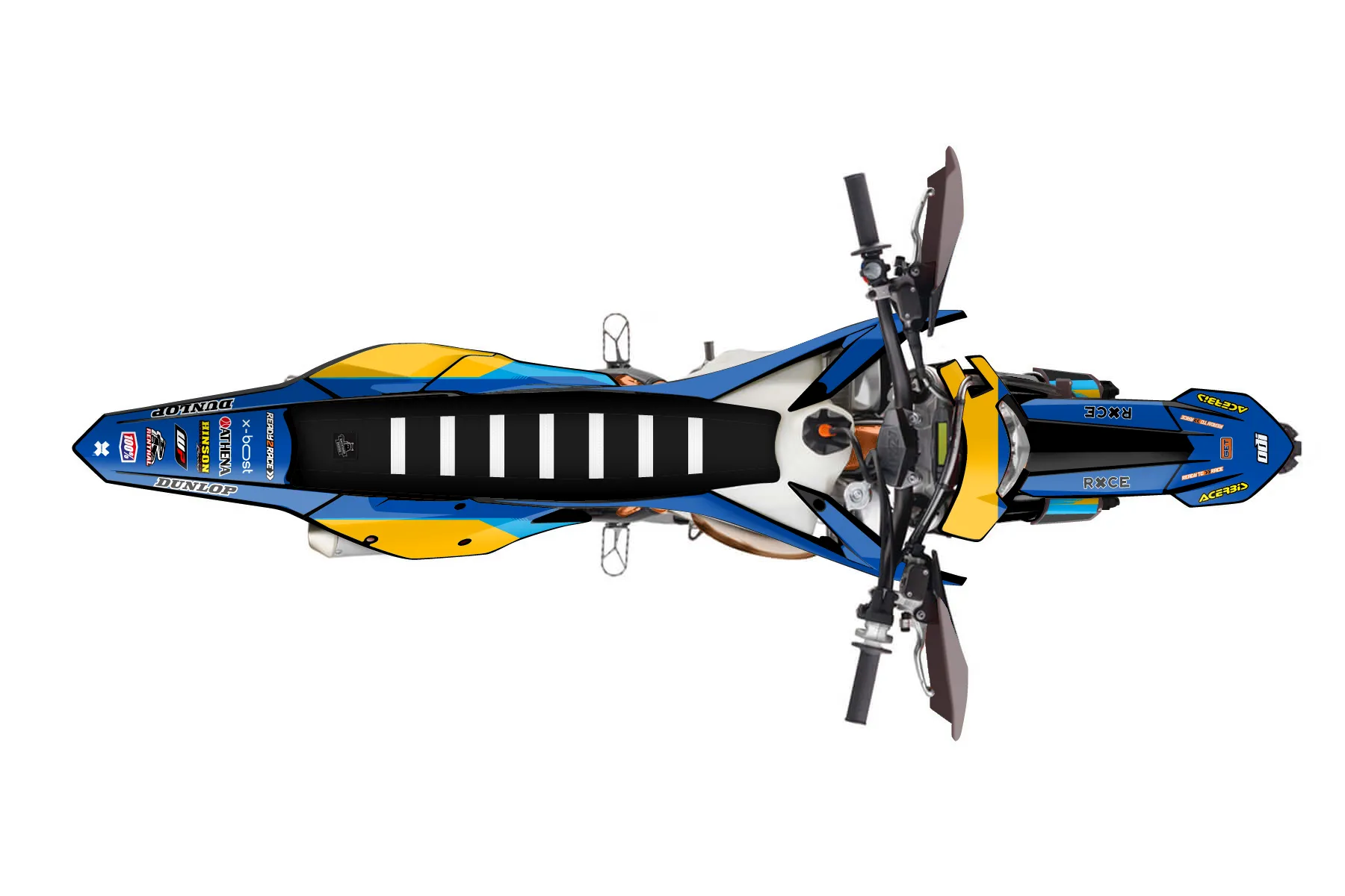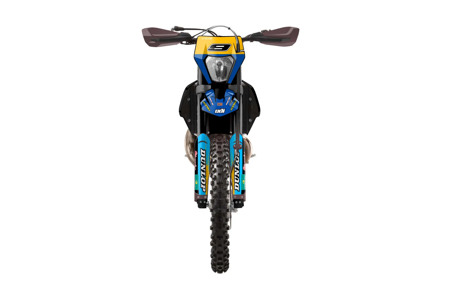 «CustomDesignBLUE8» — готовый комплект графики серии Untucked для KTM Enduro Graphic Kit KTM EXC 250 2017. В комплекте: графика на бак и боковые облицовки, крылья (переднее и заднее), передний щиток, номерные таблички, защита вилки. Материал: ПВХ-винил 80 мкр с холодной ламинацией 300 мкр, общая толщина 380 мкр; покрытие глянцевое или матовое на выбор. Устойчив к UV-излучению, воде, бензину и мойке высокого давления. Клей акриловый на сольвентной основе — постоянный, для гибких пластиков. На простых поверхностях монтируется без нагрева; для сложных изгибов рекомендуем фен. Этот пресет можно заказать как есть или взять за основу в конструкторе: поменять цвета, добавить стартовый номер и свой бренд. Производство — 3–5 рабочих дней, доставка по России СДЭКом или Почтой, по СНГ — курьерскими службами.