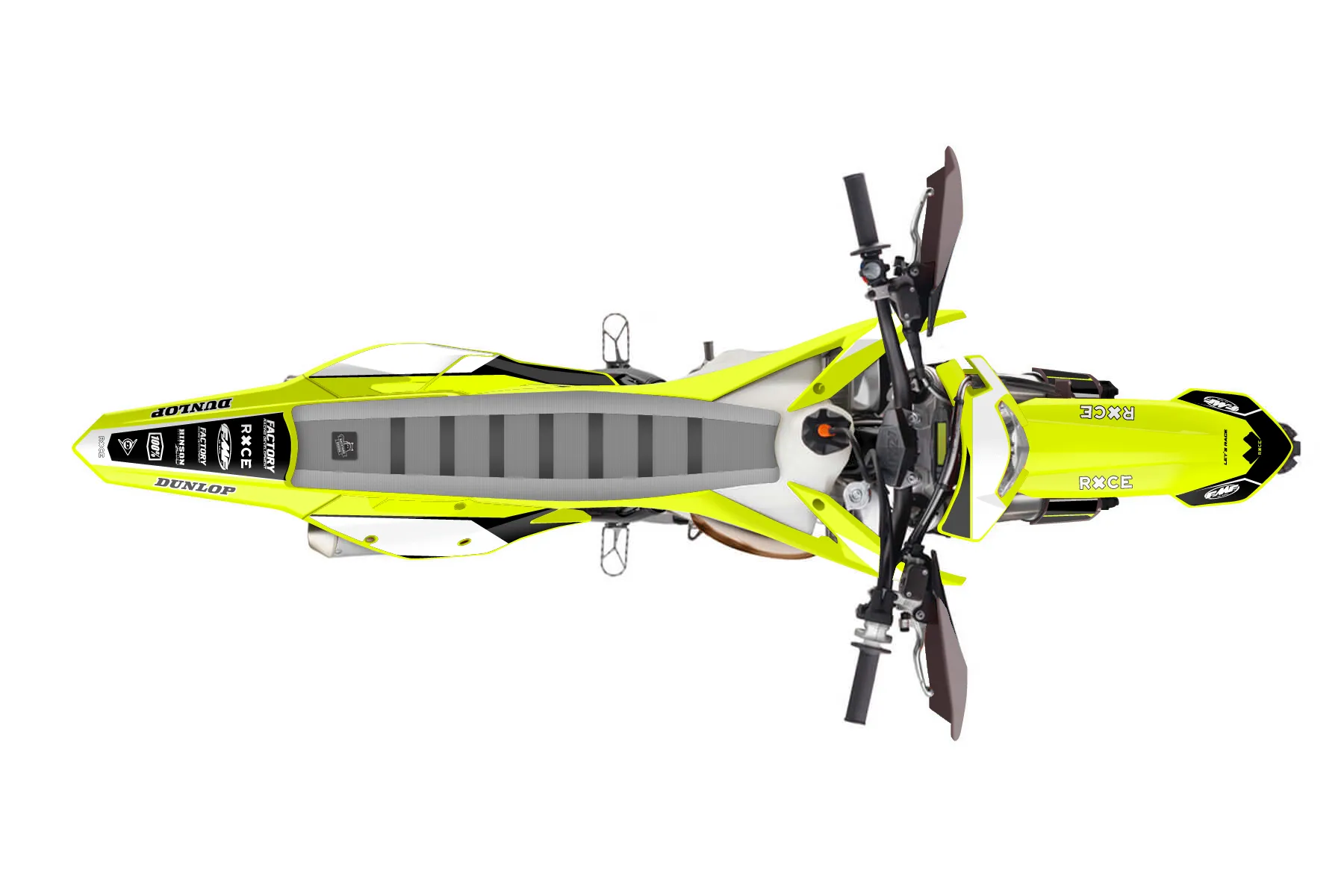 «Bright Neon» — готовый комплект графики серии Maverick для KTM Enduro Graphic Kit KTM EXC 300 2017. В комплекте: графика на бак и боковые облицовки, крылья (переднее и заднее), передний щиток, номерные таблички, защита вилки. Материал: ПВХ-винил 80 мкр с холодной ламинацией 300 мкр, общая толщина 380 мкр; покрытие глянцевое или матовое на выбор. Устойчив к UV-излучению, воде, бензину и мойке высокого давления. Клей акриловый на сольвентной основе — постоянный, для гибких пластиков. На простых поверхностях монтируется без нагрева; для сложных изгибов рекомендуем фен. Этот пресет можно заказать как есть или взять за основу в конструкторе: поменять цвета, добавить стартовый номер и свой бренд. Производство — 3–5 рабочих дней, доставка по России СДЭКом или Почтой, по СНГ — курьерскими службами.