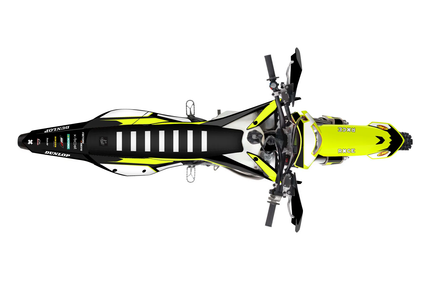 «Lucent Neon» — готовый комплект графики серии Flow для KTM Enduro Graphic Kit KTM EXC 300 2020. В комплекте: графика на бак и боковые облицовки, крылья (переднее и заднее), передний щиток, номерные таблички, защита вилки. Материал: ПВХ-винил 80 мкр с холодной ламинацией 300 мкр, общая толщина 380 мкр; покрытие глянцевое или матовое на выбор. Устойчив к UV-излучению, воде, бензину и мойке высокого давления. Клей акриловый на сольвентной основе — постоянный, для гибких пластиков. На простых поверхностях монтируется без нагрева; для сложных изгибов рекомендуем фен. Этот пресет можно заказать как есть или взять за основу в конструкторе: поменять цвета, добавить стартовый номер и свой бренд. Производство — 3–5 рабочих дней, доставка по России СДЭКом или Почтой, по СНГ — курьерскими службами.