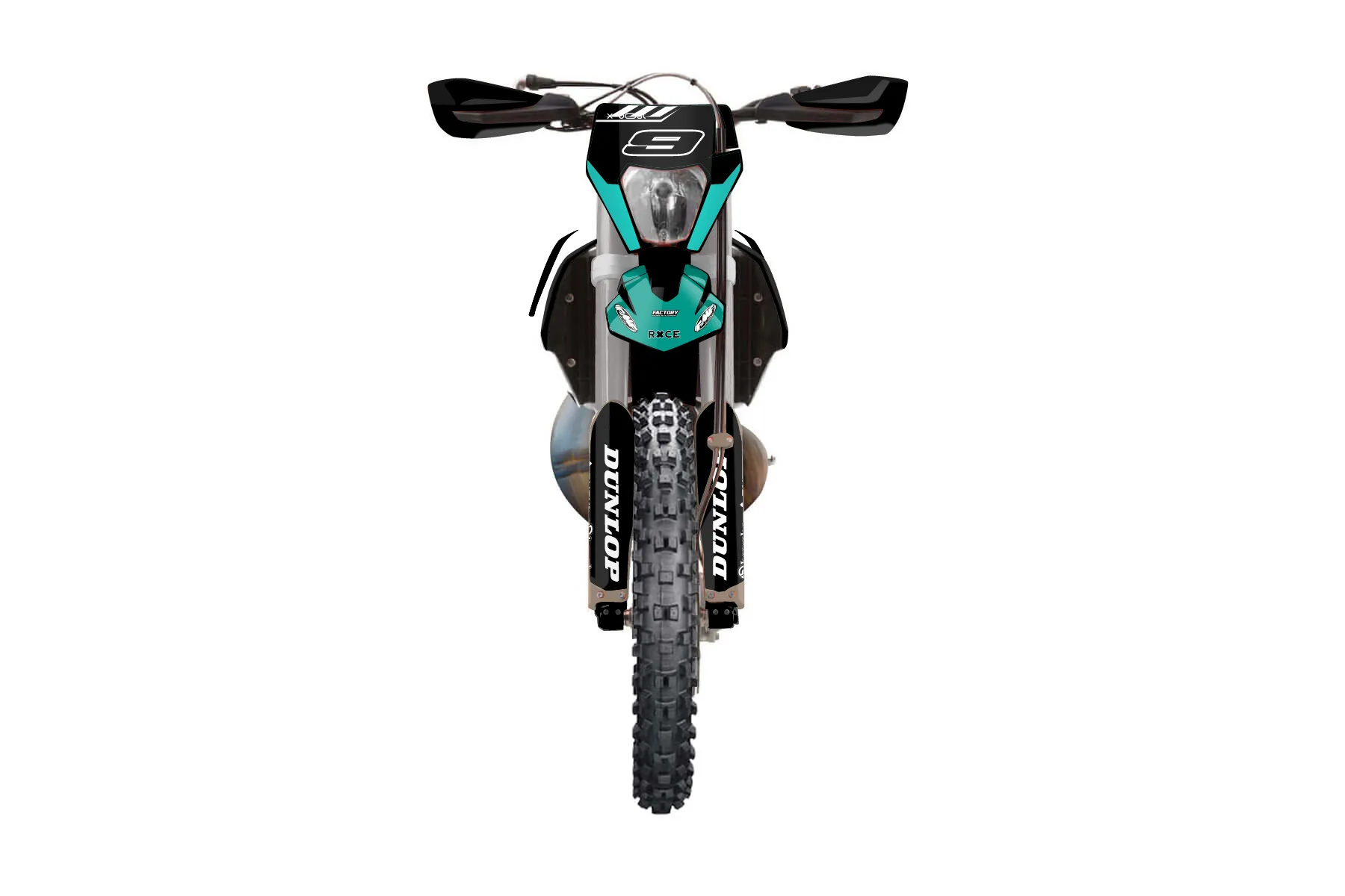 «1» — готовый комплект графики серии Maverick для KTM Enduro Graphic Kit KTM EXC 300 2020. В комплекте: графика на бак и боковые облицовки, крылья (переднее и заднее), передний щиток, номерные таблички, защита вилки. Материал: ПВХ-винил 80 мкр с холодной ламинацией 300 мкр, общая толщина 380 мкр; покрытие глянцевое или матовое на выбор. Устойчив к UV-излучению, воде, бензину и мойке высокого давления. Клей акриловый на сольвентной основе — постоянный, для гибких пластиков. На простых поверхностях монтируется без нагрева; для сложных изгибов рекомендуем фен. Этот пресет можно заказать как есть или взять за основу в конструкторе: поменять цвета, добавить стартовый номер и свой бренд. Производство — 3–5 рабочих дней, доставка по России СДЭКом или Почтой, по СНГ — курьерскими службами.