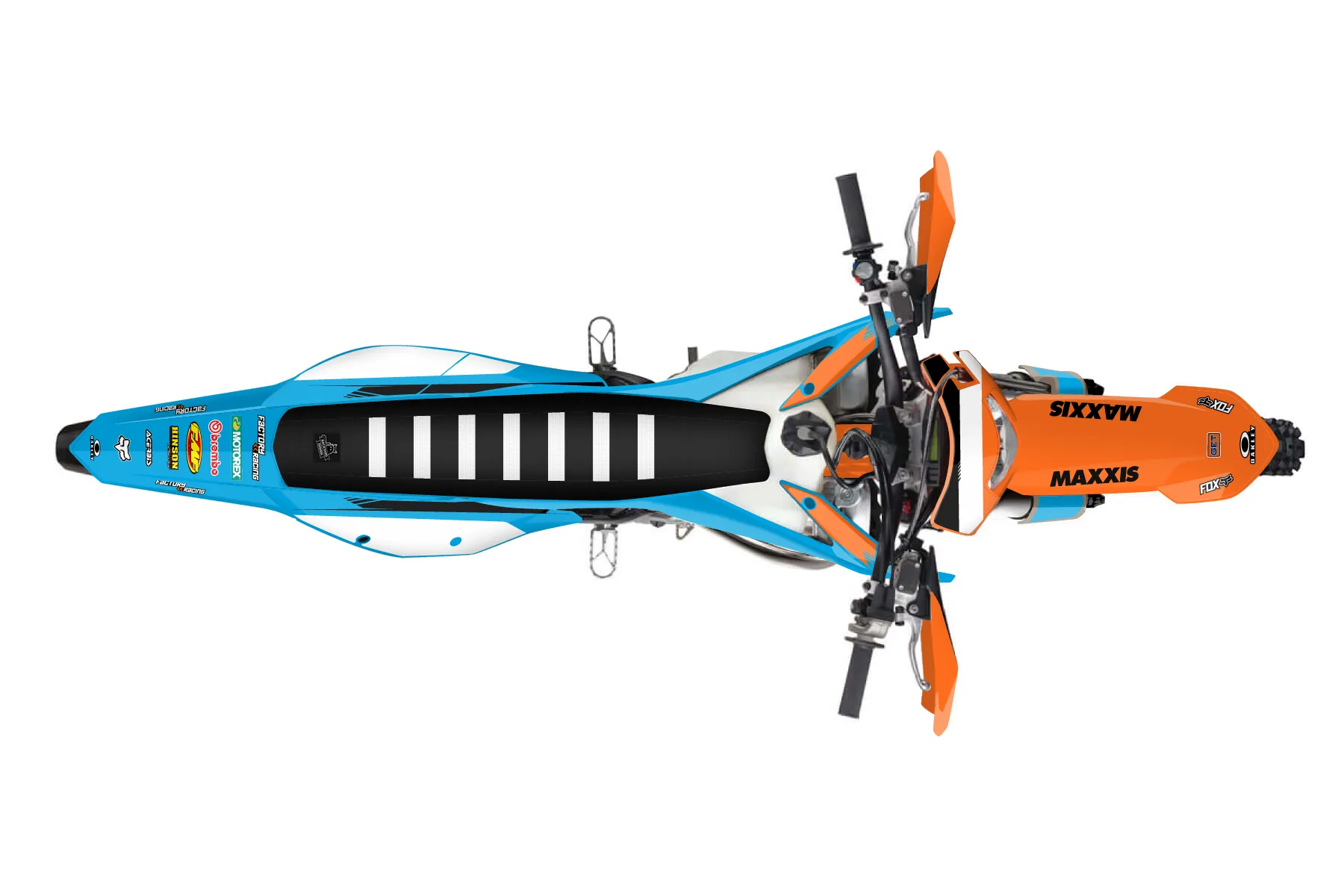 «KTM 300 Blue_Orange Design» — готовый комплект графики серии Untucked для KTM Enduro Graphic Kit KTM EXC 300 2020. В комплекте: графика на бак и боковые облицовки, крылья (переднее и заднее), передний щиток, номерные таблички, защита вилки. Материал: ПВХ-винил 80 мкр с холодной ламинацией 300 мкр, общая толщина 380 мкр; покрытие глянцевое или матовое на выбор. Устойчив к UV-излучению, воде, бензину и мойке высокого давления. Клей акриловый на сольвентной основе — постоянный, для гибких пластиков. На простых поверхностях монтируется без нагрева; для сложных изгибов рекомендуем фен. Этот пресет можно заказать как есть или взять за основу в конструкторе: поменять цвета, добавить стартовый номер и свой бренд. Производство — 3–5 рабочих дней, доставка по России СДЭКом или Почтой, по СНГ — курьерскими службами.