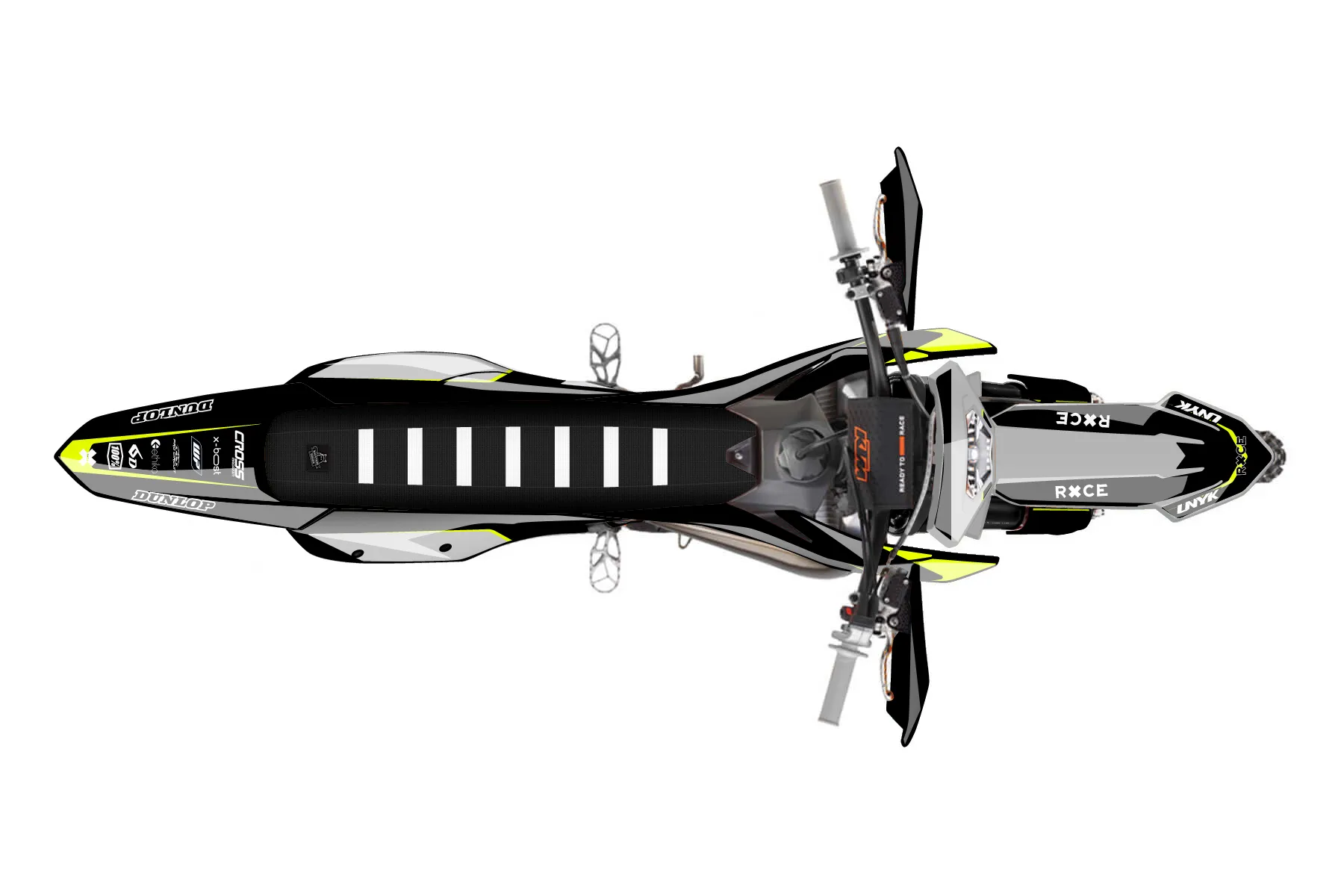 «Fluo» — готовый комплект графики серии Flow для KTM Enduro Graphic Kit KTM EXC 300 2024. В комплекте: графика на бак и боковые облицовки, крылья (переднее и заднее), передний щиток, номерные таблички, защита вилки. Материал: ПВХ-винил 80 мкр с холодной ламинацией 300 мкр, общая толщина 380 мкр; покрытие глянцевое или матовое на выбор. Устойчив к UV-излучению, воде, бензину и мойке высокого давления. Клей акриловый на сольвентной основе — постоянный, для гибких пластиков. На простых поверхностях монтируется без нагрева; для сложных изгибов рекомендуем фен. Этот пресет можно заказать как есть или взять за основу в конструкторе: поменять цвета, добавить стартовый номер и свой бренд. Производство — 3–5 рабочих дней, доставка по России СДЭКом или Почтой, по СНГ — курьерскими службами.