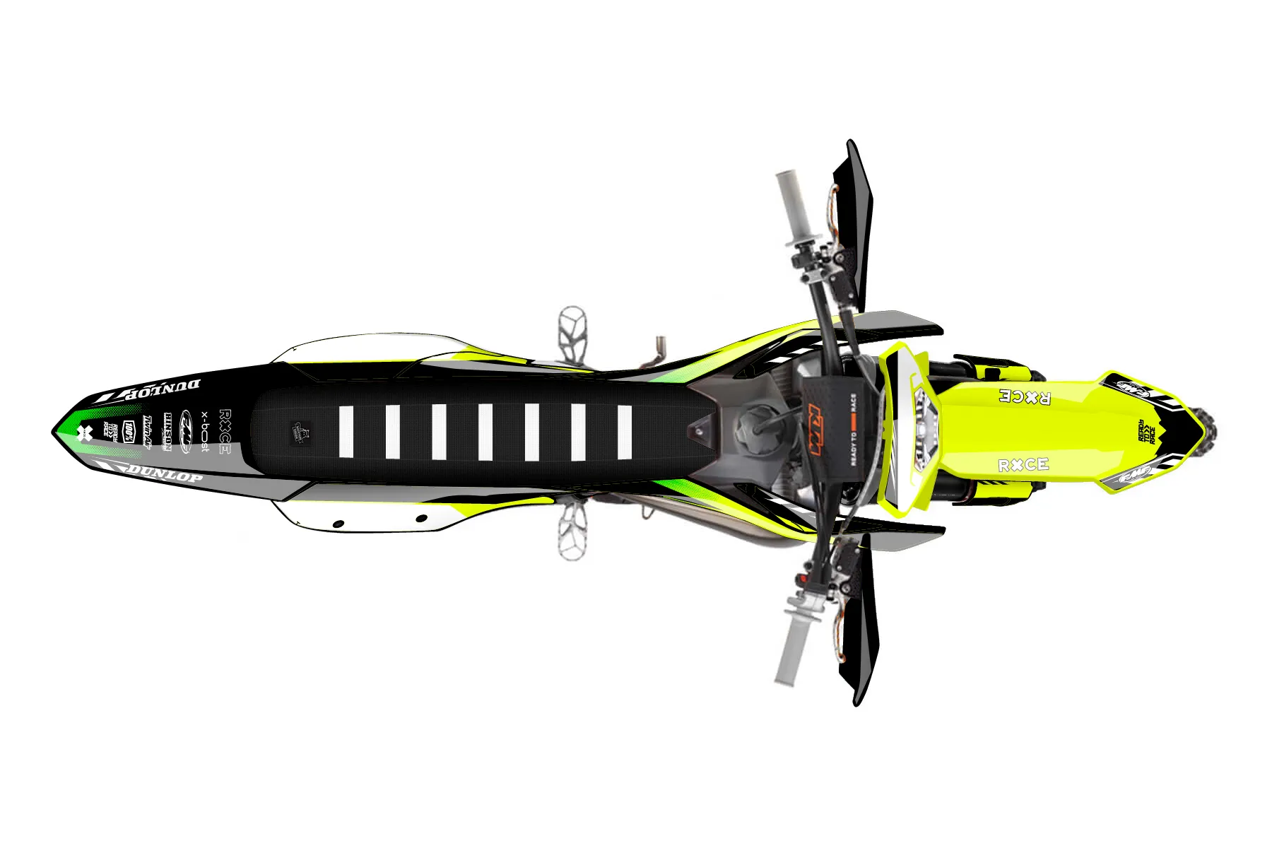 «Volt Neon» — готовый комплект графики серии Maverick для KTM Enduro Graphic Kit KTM EXC 300 2024. В комплекте: графика на бак и боковые облицовки, крылья (переднее и заднее), передний щиток, номерные таблички, защита вилки. Материал: ПВХ-винил 80 мкр с холодной ламинацией 300 мкр, общая толщина 380 мкр; покрытие глянцевое или матовое на выбор. Устойчив к UV-излучению, воде, бензину и мойке высокого давления. Клей акриловый на сольвентной основе — постоянный, для гибких пластиков. На простых поверхностях монтируется без нагрева; для сложных изгибов рекомендуем фен. Этот пресет можно заказать как есть или взять за основу в конструкторе: поменять цвета, добавить стартовый номер и свой бренд. Производство — 3–5 рабочих дней, доставка по России СДЭКом или Почтой, по СНГ — курьерскими службами.