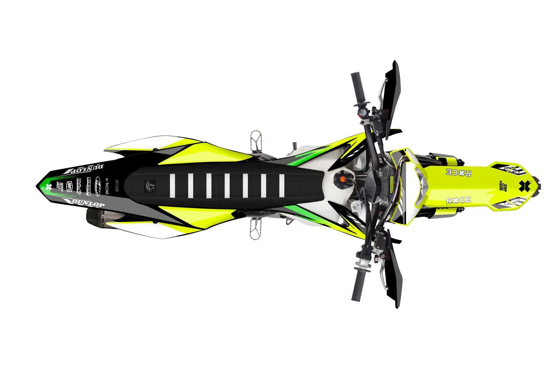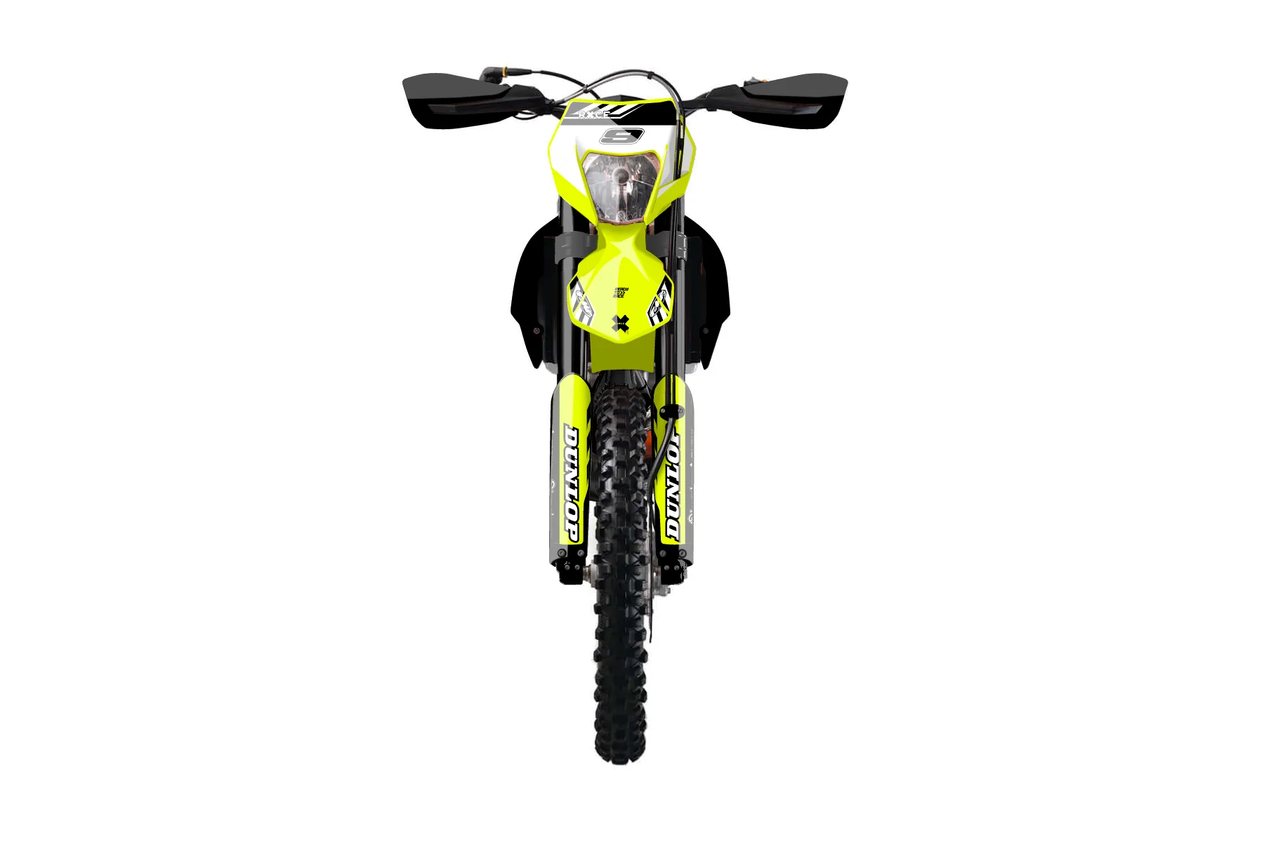«Volt Neon» — готовый комплект графики серии Maverick для KTM Enduro Graphic Kit KTM EXC-F 250 2016. В комплекте: графика на бак и боковые облицовки, крылья (переднее и заднее), передний щиток, номерные таблички, защита вилки. Материал: ПВХ-винил 80 мкр с холодной ламинацией 300 мкр, общая толщина 380 мкр; покрытие глянцевое или матовое на выбор. Устойчив к UV-излучению, воде, бензину и мойке высокого давления. Клей акриловый на сольвентной основе — постоянный, для гибких пластиков. На простых поверхностях монтируется без нагрева; для сложных изгибов рекомендуем фен. Этот пресет можно заказать как есть или взять за основу в конструкторе: поменять цвета, добавить стартовый номер и свой бренд. Производство — 3–5 рабочих дней, доставка по России СДЭКом или Почтой, по СНГ — курьерскими службами.