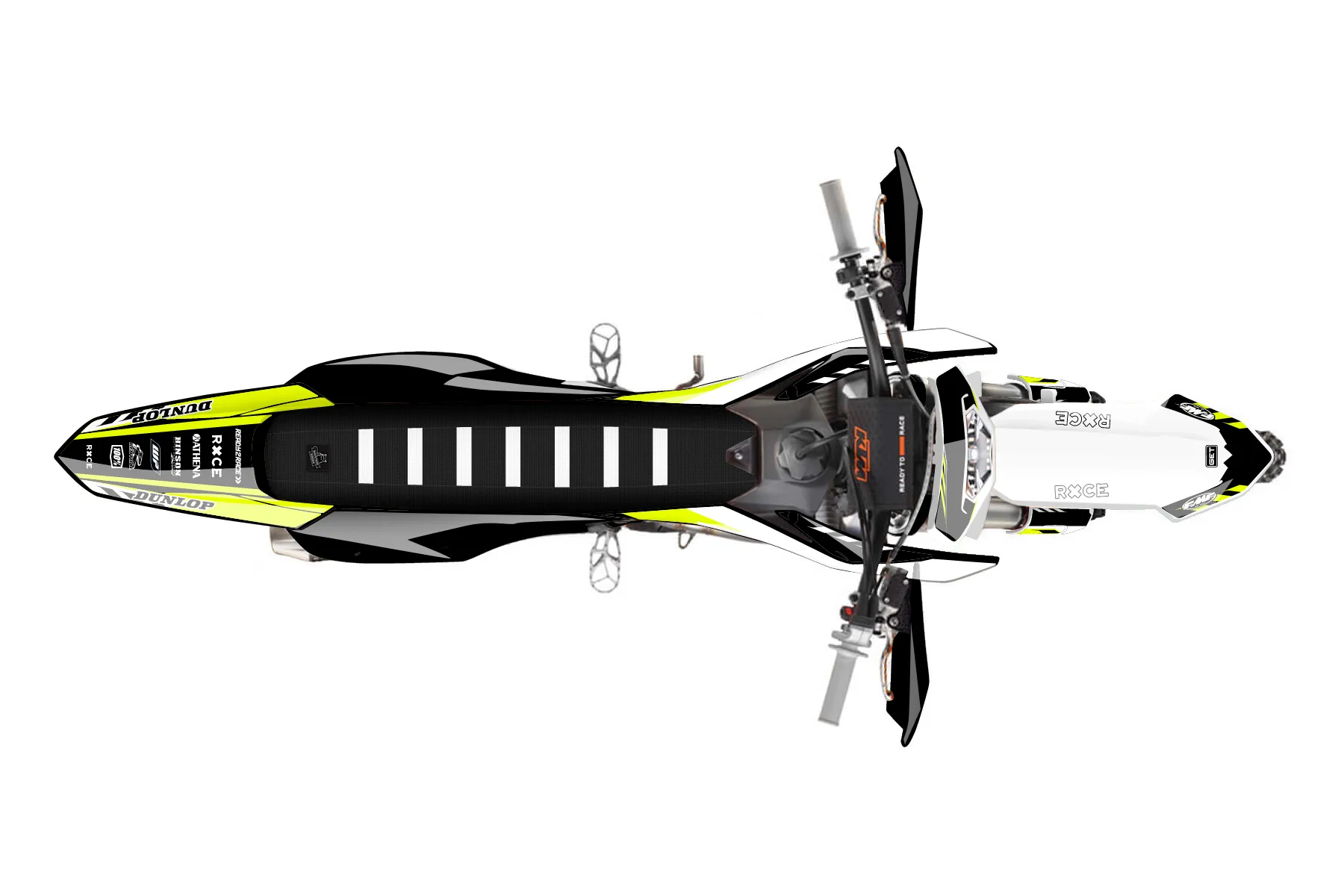«Grip Neon» — готовый комплект графики серии Maverick для KTM Enduro Graphic Kit KTM EXC-F 250 2024. В комплекте: графика на бак и боковые облицовки, крылья (переднее и заднее), передний щиток, номерные таблички, защита вилки. Материал: ПВХ-винил 80 мкр с холодной ламинацией 300 мкр, общая толщина 380 мкр; покрытие глянцевое или матовое на выбор. Устойчив к UV-излучению, воде, бензину и мойке высокого давления. Клей акриловый на сольвентной основе — постоянный, для гибких пластиков. На простых поверхностях монтируется без нагрева; для сложных изгибов рекомендуем фен. Этот пресет можно заказать как есть или взять за основу в конструкторе: поменять цвета, добавить стартовый номер и свой бренд. Производство — 3–5 рабочих дней, доставка по России СДЭКом или Почтой, по СНГ — курьерскими службами.