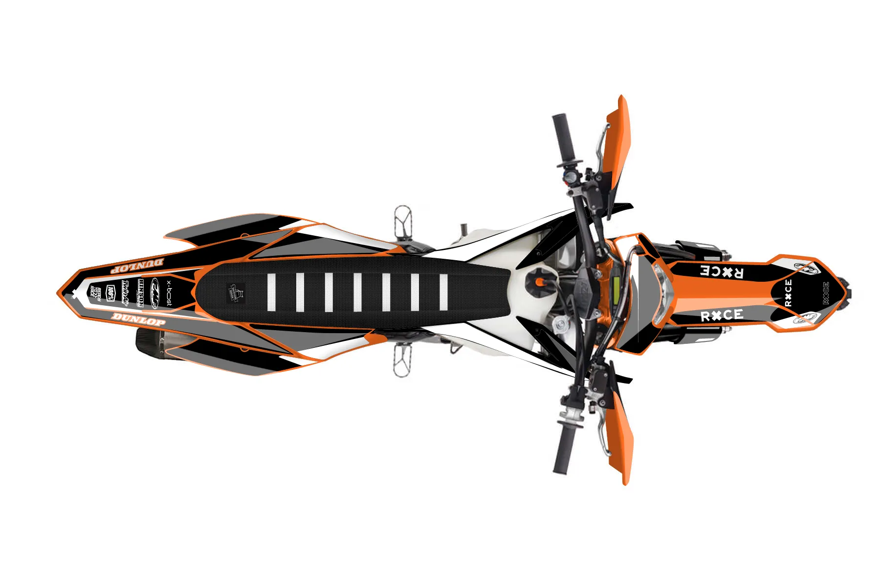 «Race» — готовый комплект графики серии Flow для KTM Enduro Graphic Kit KTM EXC-F 350 2016. В комплекте: графика на бак и боковые облицовки, крылья (переднее и заднее), передний щиток, номерные таблички, защита вилки. Материал: ПВХ-винил 80 мкр с холодной ламинацией 300 мкр, общая толщина 380 мкр; покрытие глянцевое или матовое на выбор. Устойчив к UV-излучению, воде, бензину и мойке высокого давления. Клей акриловый на сольвентной основе — постоянный, для гибких пластиков. На простых поверхностях монтируется без нагрева; для сложных изгибов рекомендуем фен. Этот пресет можно заказать как есть или взять за основу в конструкторе: поменять цвета, добавить стартовый номер и свой бренд. Производство — 3–5 рабочих дней, доставка по России СДЭКом или Почтой, по СНГ — курьерскими службами.