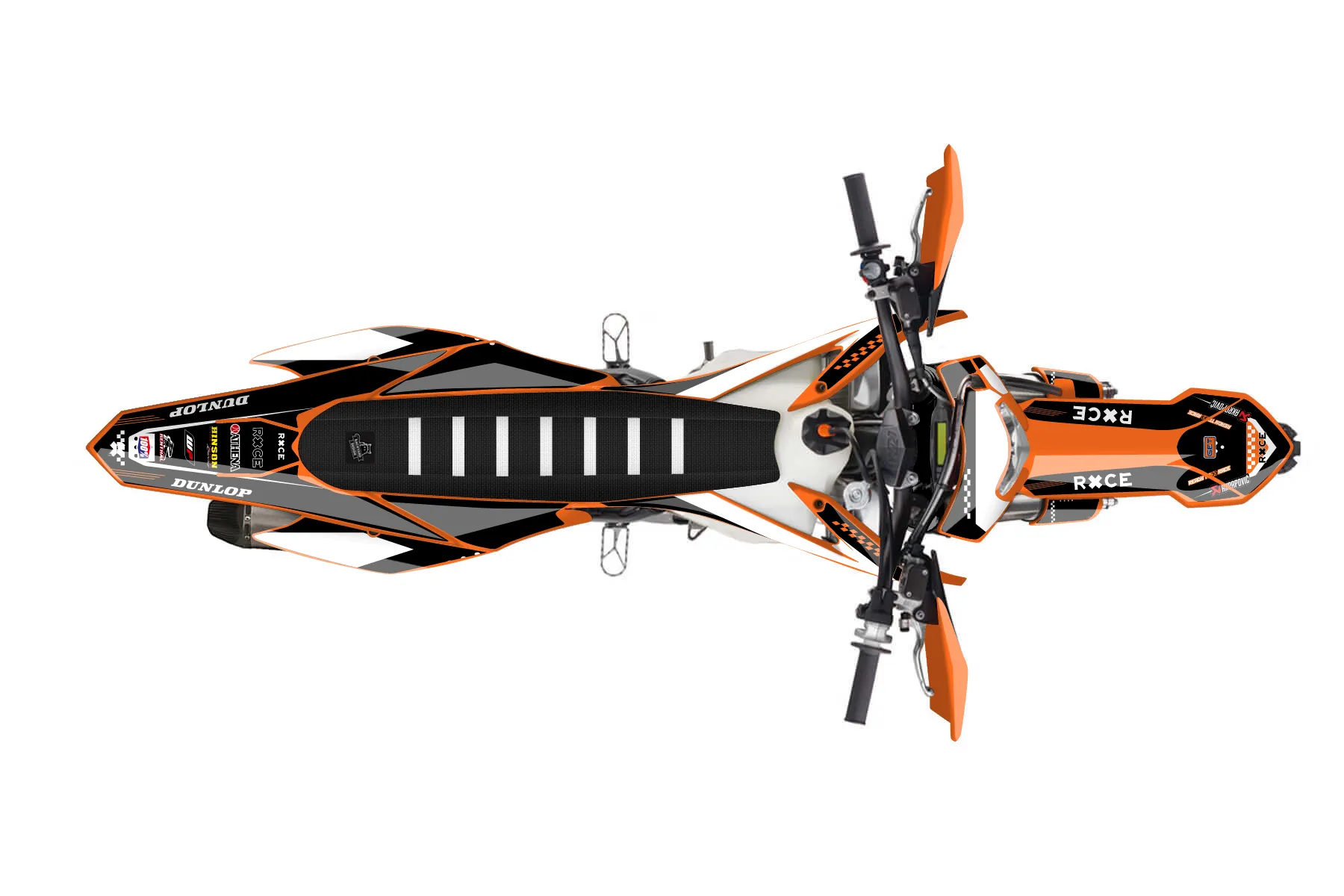 «Raw» — готовый комплект графики серии Staple для KTM Enduro Graphic Kit KTM EXC-F 350 2016. В комплекте: графика на бак и боковые облицовки, крылья (переднее и заднее), передний щиток, номерные таблички, защита вилки. Материал: ПВХ-винил 80 мкр с холодной ламинацией 300 мкр, общая толщина 380 мкр; покрытие глянцевое или матовое на выбор. Устойчив к UV-излучению, воде, бензину и мойке высокого давления. Клей акриловый на сольвентной основе — постоянный, для гибких пластиков. На простых поверхностях монтируется без нагрева; для сложных изгибов рекомендуем фен. Этот пресет можно заказать как есть или взять за основу в конструкторе: поменять цвета, добавить стартовый номер и свой бренд. Производство — 3–5 рабочих дней, доставка по России СДЭКом или Почтой, по СНГ — курьерскими службами.