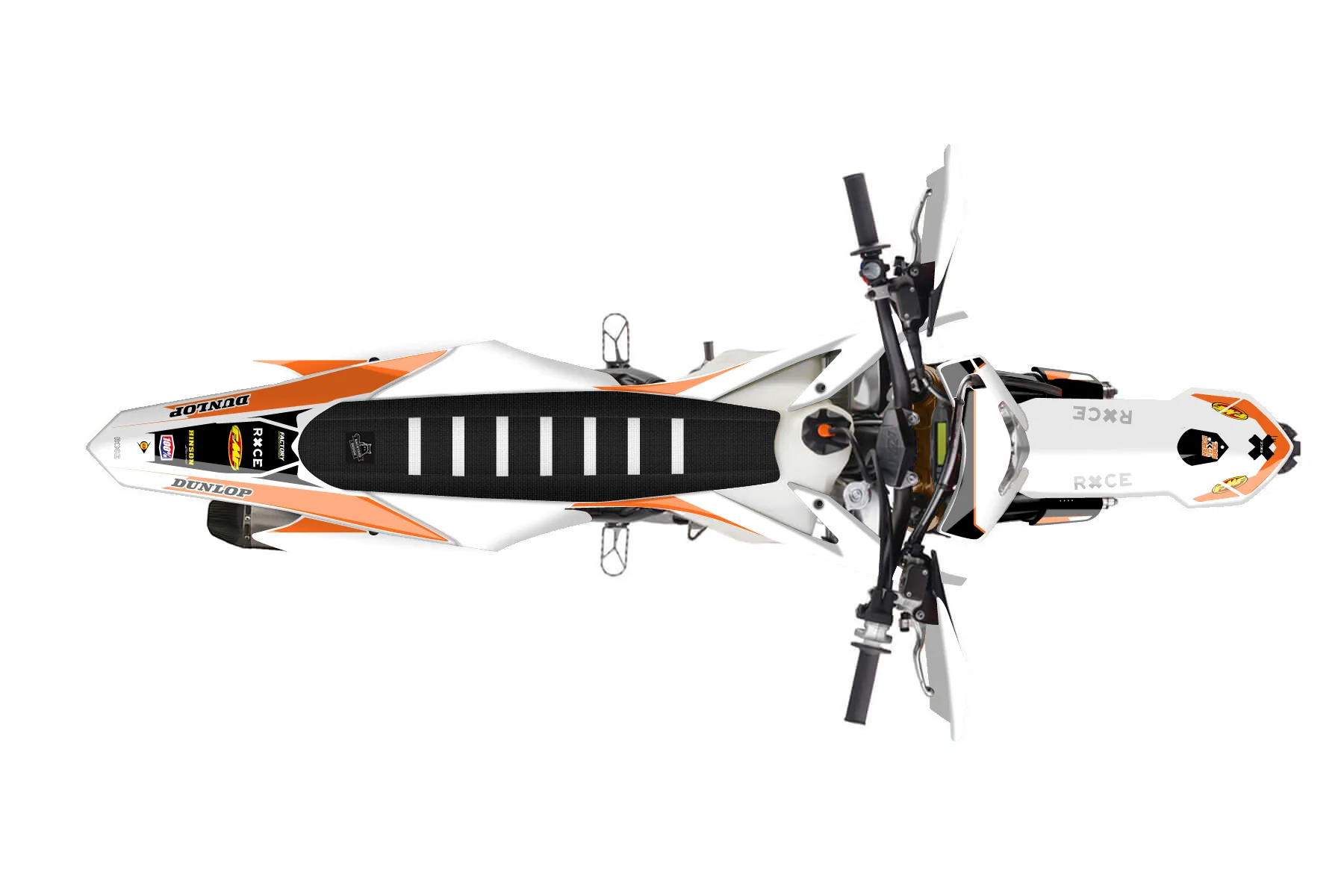 «Tilled» — готовый комплект графики серии Staple для KTM Enduro Graphic Kit KTM EXC-F 350 2016. В комплекте: графика на бак и боковые облицовки, крылья (переднее и заднее), передний щиток, номерные таблички, защита вилки. Материал: ПВХ-винил 80 мкр с холодной ламинацией 300 мкр, общая толщина 380 мкр; покрытие глянцевое или матовое на выбор. Устойчив к UV-излучению, воде, бензину и мойке высокого давления. Клей акриловый на сольвентной основе — постоянный, для гибких пластиков. На простых поверхностях монтируется без нагрева; для сложных изгибов рекомендуем фен. Этот пресет можно заказать как есть или взять за основу в конструкторе: поменять цвета, добавить стартовый номер и свой бренд. Производство — 3–5 рабочих дней, доставка по России СДЭКом или Почтой, по СНГ — курьерскими службами.