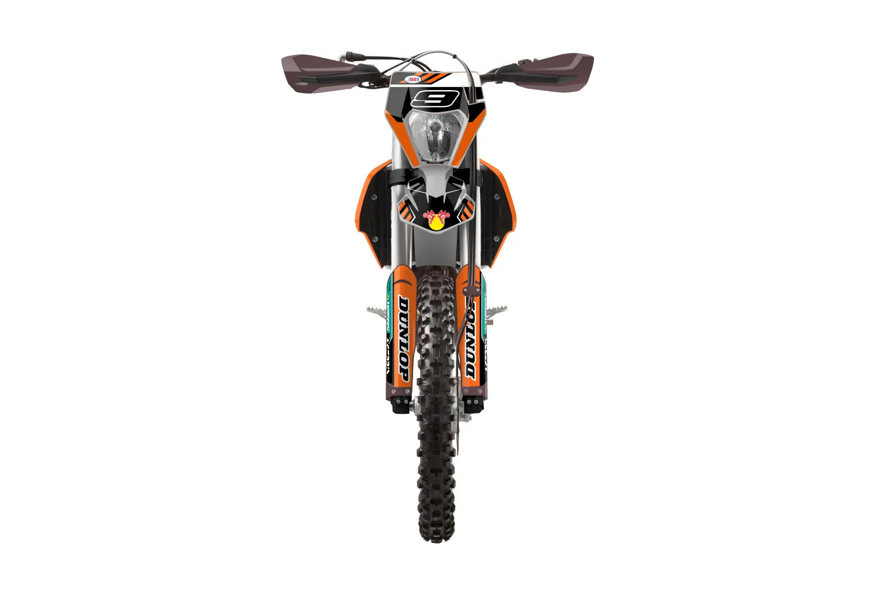 «ktm 1» — готовый комплект графики серии Maverick для KTM Enduro Graphic Kit KTM EXC-F 350 2017. В комплекте: графика на бак и боковые облицовки, крылья (переднее и заднее), передний щиток, номерные таблички, защита вилки. Материал: ПВХ-винил 80 мкр с холодной ламинацией 300 мкр, общая толщина 380 мкр; покрытие глянцевое или матовое на выбор. Устойчив к UV-излучению, воде, бензину и мойке высокого давления. Клей акриловый на сольвентной основе — постоянный, для гибких пластиков. На простых поверхностях монтируется без нагрева; для сложных изгибов рекомендуем фен. Этот пресет можно заказать как есть или взять за основу в конструкторе: поменять цвета, добавить стартовый номер и свой бренд. Производство — 3–5 рабочих дней, доставка по России СДЭКом или Почтой, по СНГ — курьерскими службами.