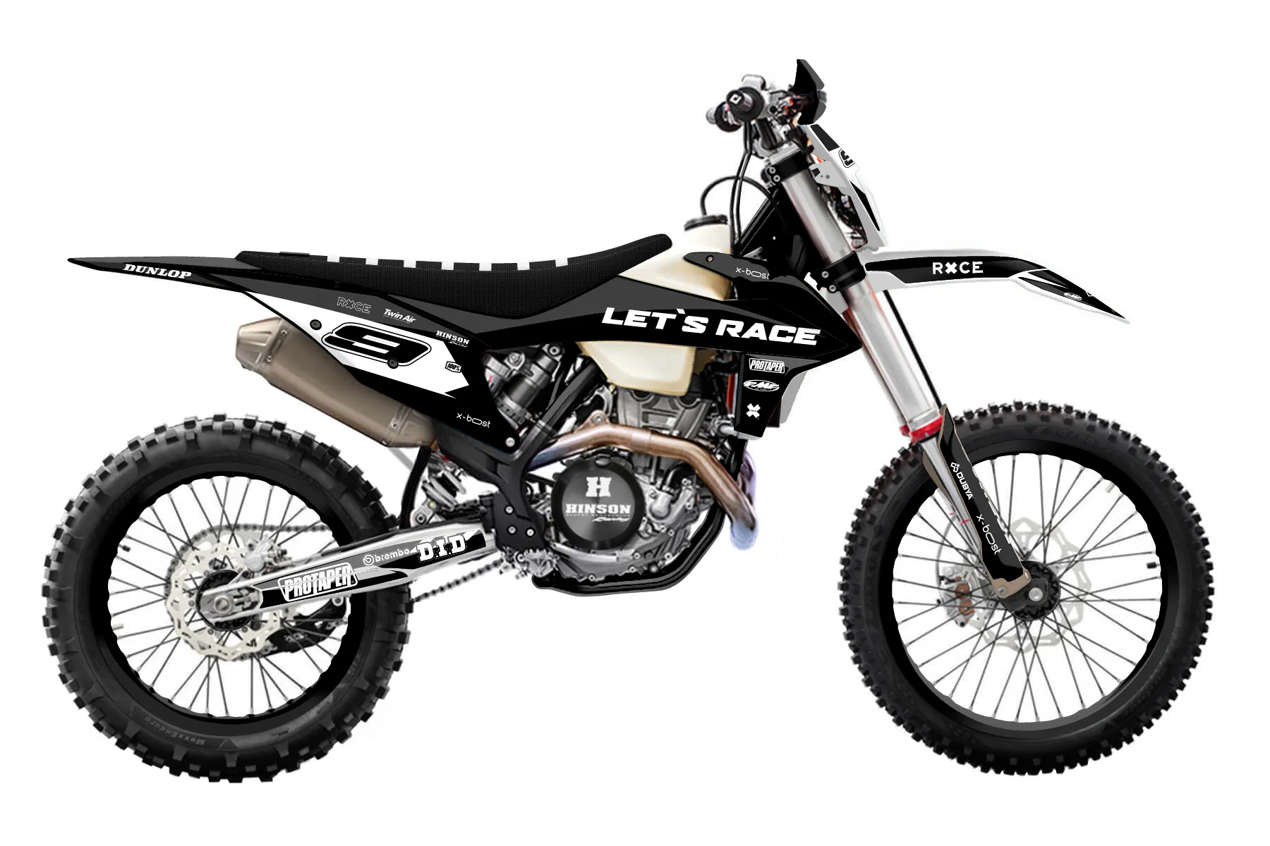 «DeCore» — готовый комплект графики серии Maverick для KTM Enduro Graphic Kit KTM EXC-F 350 2020. В комплекте: графика на бак и боковые облицовки, крылья (переднее и заднее), передний щиток, номерные таблички, защита вилки. Материал: ПВХ-винил 80 мкр с холодной ламинацией 300 мкр, общая толщина 380 мкр; покрытие глянцевое или матовое на выбор. Устойчив к UV-излучению, воде, бензину и мойке высокого давления. Клей акриловый на сольвентной основе — постоянный, для гибких пластиков. На простых поверхностях монтируется без нагрева; для сложных изгибов рекомендуем фен. Этот пресет можно заказать как есть или взять за основу в конструкторе: поменять цвета, добавить стартовый номер и свой бренд. Производство — 3–5 рабочих дней, доставка по России СДЭКом или Почтой, по СНГ — курьерскими службами.