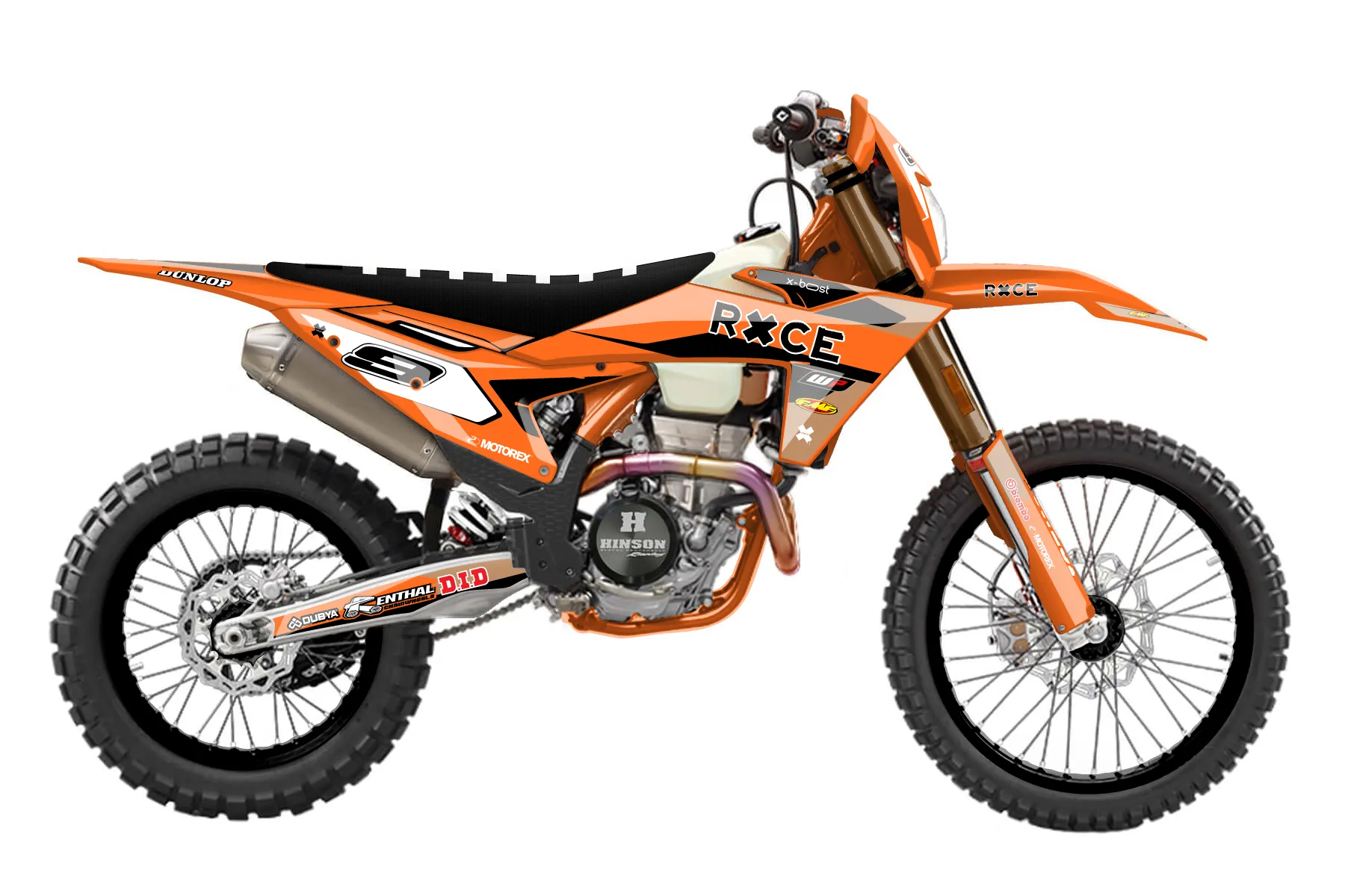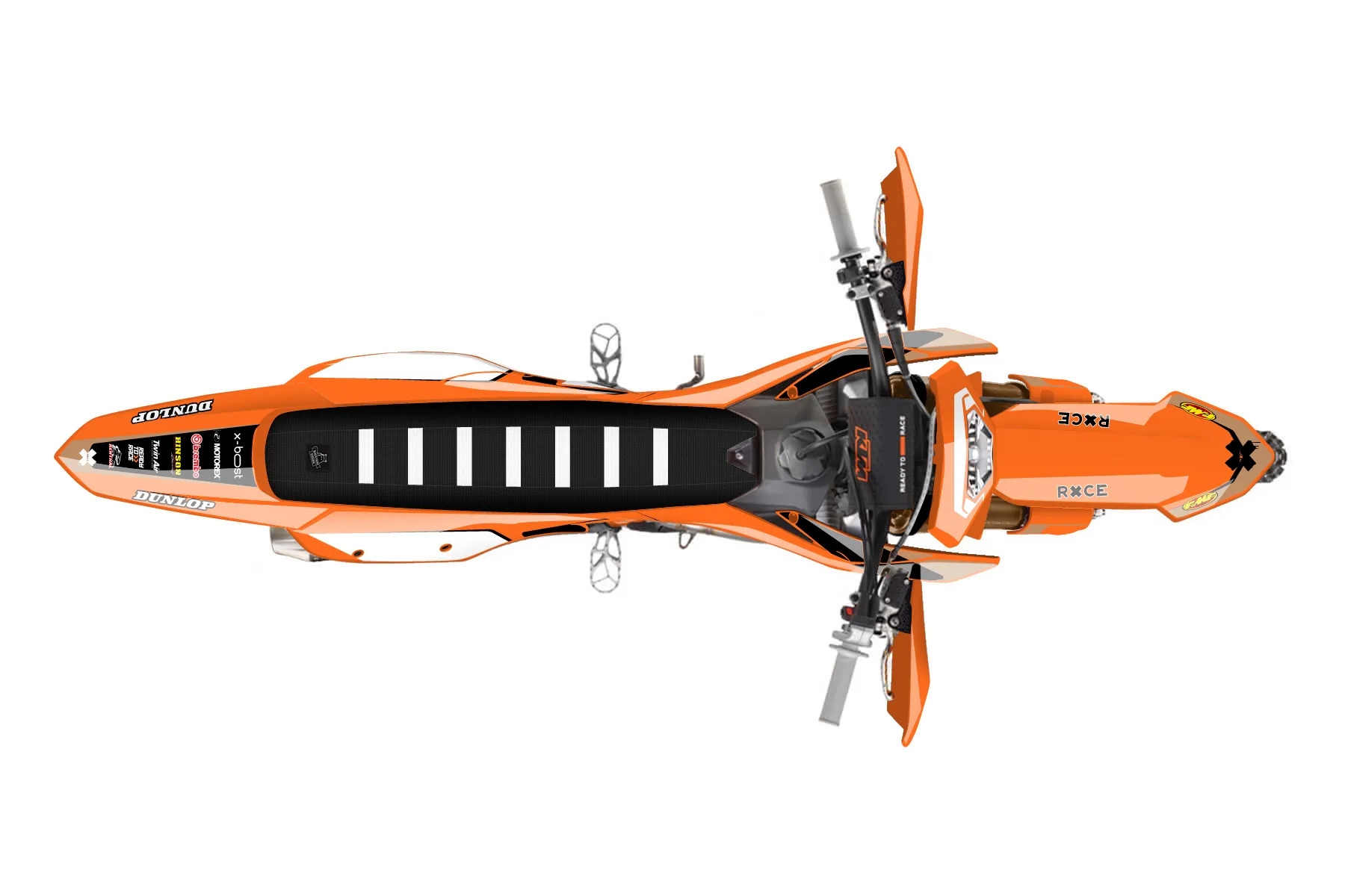 «Bang» — готовый комплект графики серии Flow для KTM Enduro Graphic Kit KTM EXC-F 350 2024. В комплекте: графика на бак и боковые облицовки, крылья (переднее и заднее), передний щиток, номерные таблички, защита вилки. Материал: ПВХ-винил 80 мкр с холодной ламинацией 300 мкр, общая толщина 380 мкр; покрытие глянцевое или матовое на выбор. Устойчив к UV-излучению, воде, бензину и мойке высокого давления. Клей акриловый на сольвентной основе — постоянный, для гибких пластиков. На простых поверхностях монтируется без нагрева; для сложных изгибов рекомендуем фен. Этот пресет можно заказать как есть или взять за основу в конструкторе: поменять цвета, добавить стартовый номер и свой бренд. Производство — 3–5 рабочих дней, доставка по России СДЭКом или Почтой, по СНГ — курьерскими службами.