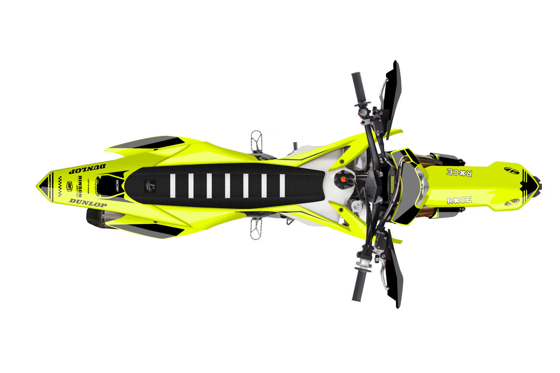 «Loose Neon» — готовый комплект графики серии Untucked для KTM Enduro Graphic Kit KTM EXC-F 450 2014. В комплекте: графика на бак и боковые облицовки, крылья (переднее и заднее), передний щиток, номерные таблички, защита вилки. Материал: ПВХ-винил 80 мкр с холодной ламинацией 300 мкр, общая толщина 380 мкр; покрытие глянцевое или матовое на выбор. Устойчив к UV-излучению, воде, бензину и мойке высокого давления. Клей акриловый на сольвентной основе — постоянный, для гибких пластиков. На простых поверхностях монтируется без нагрева; для сложных изгибов рекомендуем фен. Этот пресет можно заказать как есть или взять за основу в конструкторе: поменять цвета, добавить стартовый номер и свой бренд. Производство — 3–5 рабочих дней, доставка по России СДЭКом или Почтой, по СНГ — курьерскими службами.