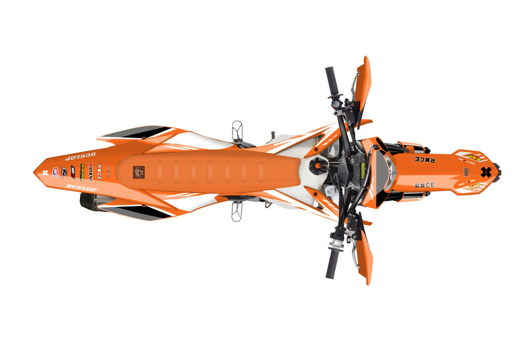 «Train» — готовый комплект графики серии Maverick для KTM Enduro Graphic Kit KTM EXC-F 450 2016. В комплекте: графика на бак и боковые облицовки, крылья (переднее и заднее), передний щиток, номерные таблички, защита вилки. Материал: ПВХ-винил 80 мкр с холодной ламинацией 300 мкр, общая толщина 380 мкр; покрытие глянцевое или матовое на выбор. Устойчив к UV-излучению, воде, бензину и мойке высокого давления. Клей акриловый на сольвентной основе — постоянный, для гибких пластиков. На простых поверхностях монтируется без нагрева; для сложных изгибов рекомендуем фен. Этот пресет можно заказать как есть или взять за основу в конструкторе: поменять цвета, добавить стартовый номер и свой бренд. Производство — 3–5 рабочих дней, доставка по России СДЭКом или Почтой, по СНГ — курьерскими службами.