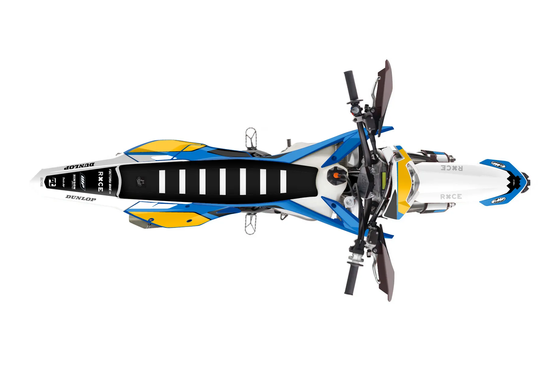 «All-Star» — готовый комплект графики серии Flow для KTM Enduro Graphic Kit KTM EXC-F 450 2017. В комплекте: графика на бак и боковые облицовки, крылья (переднее и заднее), передний щиток, номерные таблички, защита вилки. Материал: ПВХ-винил 80 мкр с холодной ламинацией 300 мкр, общая толщина 380 мкр; покрытие глянцевое или матовое на выбор. Устойчив к UV-излучению, воде, бензину и мойке высокого давления. Клей акриловый на сольвентной основе — постоянный, для гибких пластиков. На простых поверхностях монтируется без нагрева; для сложных изгибов рекомендуем фен. Этот пресет можно заказать как есть или взять за основу в конструкторе: поменять цвета, добавить стартовый номер и свой бренд. Производство — 3–5 рабочих дней, доставка по России СДЭКом или Почтой, по СНГ — курьерскими службами.
