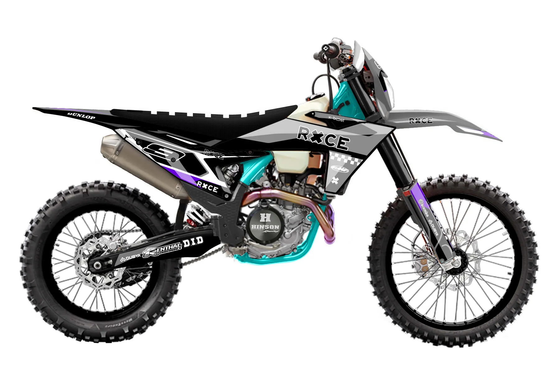 «Cyber Pirate» — готовый комплект графики серии Flow для KTM Enduro Graphic Kit KTM EXC-F 450 2024. В комплекте: графика на бак и боковые облицовки, крылья (переднее и заднее), передний щиток, номерные таблички, защита вилки. Материал: ПВХ-винил 80 мкр с холодной ламинацией 300 мкр, общая толщина 380 мкр; покрытие глянцевое или матовое на выбор. Устойчив к UV-излучению, воде, бензину и мойке высокого давления. Клей акриловый на сольвентной основе — постоянный, для гибких пластиков. На простых поверхностях монтируется без нагрева; для сложных изгибов рекомендуем фен. Этот пресет можно заказать как есть или взять за основу в конструкторе: поменять цвета, добавить стартовый номер и свой бренд. Производство — 3–5 рабочих дней, доставка по России СДЭКом или Почтой, по СНГ — курьерскими службами.