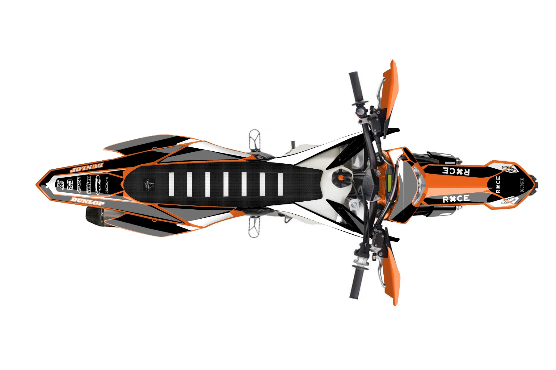«Race» — готовый комплект графики серии Flow для KTM Enduro Graphic Kit KTM EXC-F 500 2016. В комплекте: графика на бак и боковые облицовки, крылья (переднее и заднее), передний щиток, номерные таблички, защита вилки. Материал: ПВХ-винил 80 мкр с холодной ламинацией 300 мкр, общая толщина 380 мкр; покрытие глянцевое или матовое на выбор. Устойчив к UV-излучению, воде, бензину и мойке высокого давления. Клей акриловый на сольвентной основе — постоянный, для гибких пластиков. На простых поверхностях монтируется без нагрева; для сложных изгибов рекомендуем фен. Этот пресет можно заказать как есть или взять за основу в конструкторе: поменять цвета, добавить стартовый номер и свой бренд. Производство — 3–5 рабочих дней, доставка по России СДЭКом или Почтой, по СНГ — курьерскими службами.