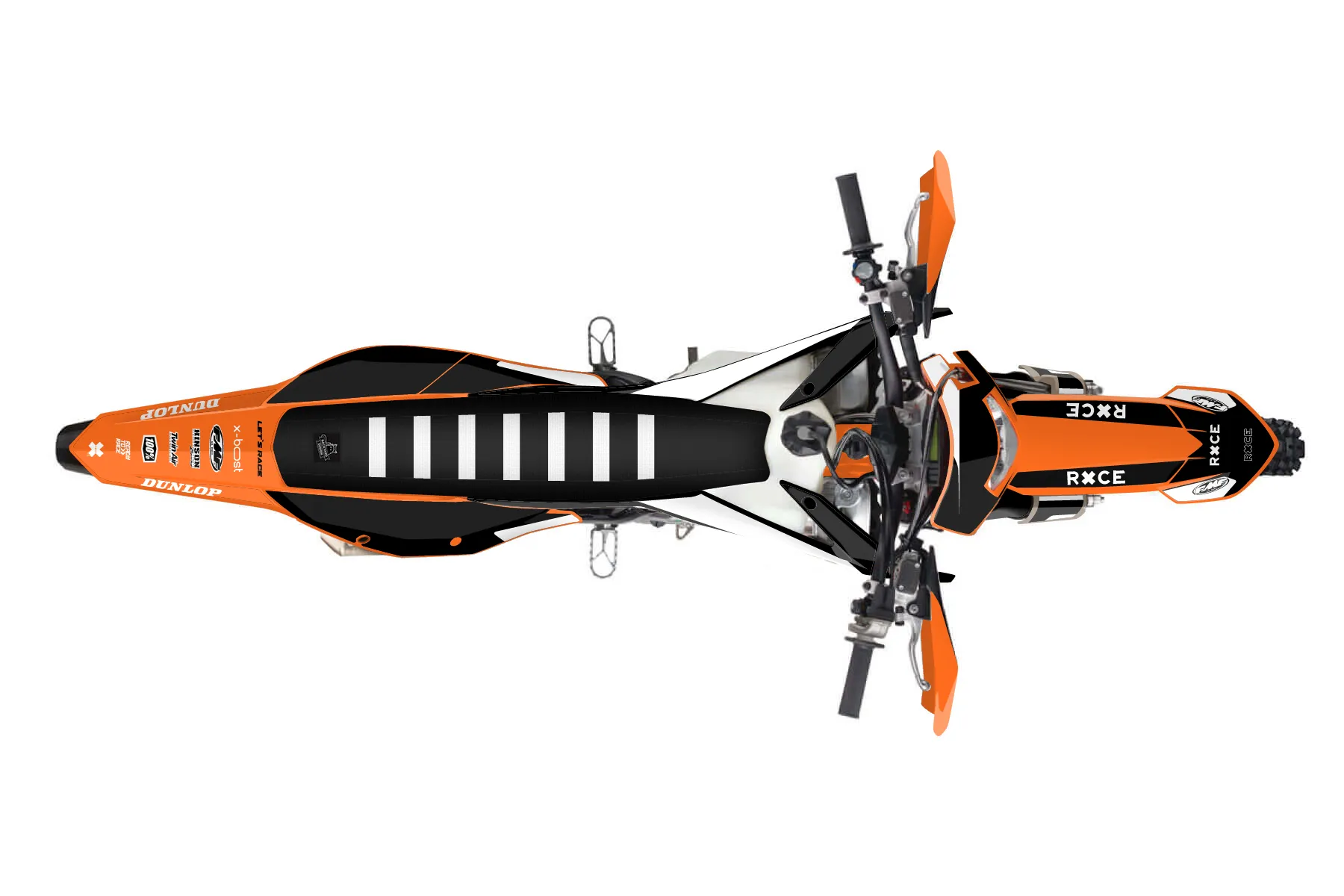 «Race» — готовый комплект графики серии Flow для KTM Enduro Graphic Kit KTM EXC-F 500 2020. В комплекте: графика на бак и боковые облицовки, крылья (переднее и заднее), передний щиток, номерные таблички, защита вилки. Материал: ПВХ-винил 80 мкр с холодной ламинацией 300 мкр, общая толщина 380 мкр; покрытие глянцевое или матовое на выбор. Устойчив к UV-излучению, воде, бензину и мойке высокого давления. Клей акриловый на сольвентной основе — постоянный, для гибких пластиков. На простых поверхностях монтируется без нагрева; для сложных изгибов рекомендуем фен. Этот пресет можно заказать как есть или взять за основу в конструкторе: поменять цвета, добавить стартовый номер и свой бренд. Производство — 3–5 рабочих дней, доставка по России СДЭКом или Почтой, по СНГ — курьерскими службами.