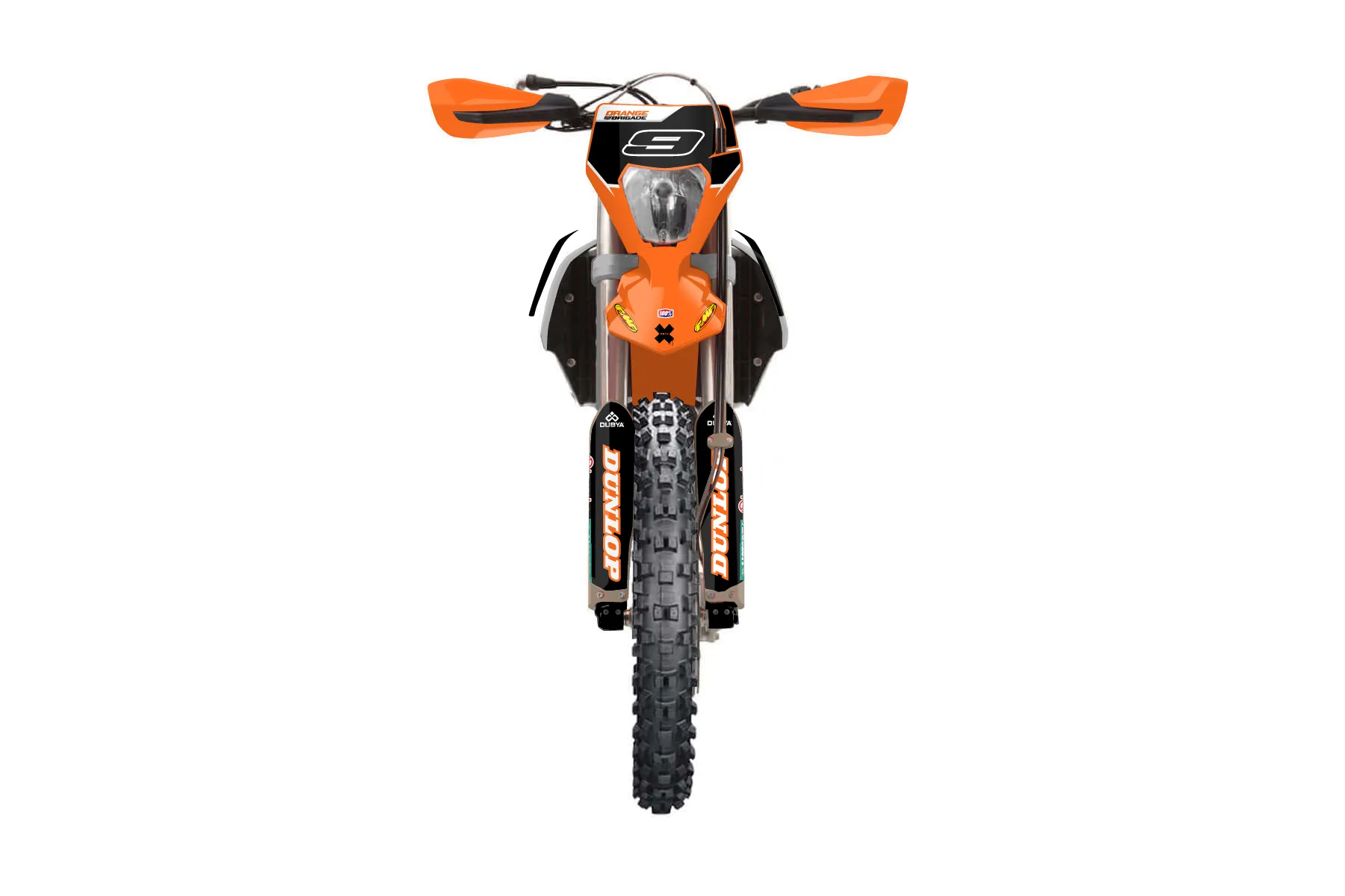 «Eleven» — готовый комплект графики серии Maverick для KTM Enduro Graphic Kit KTM EXC-F 500 2020. В комплекте: графика на бак и боковые облицовки, крылья (переднее и заднее), передний щиток, номерные таблички, защита вилки. Материал: ПВХ-винил 80 мкр с холодной ламинацией 300 мкр, общая толщина 380 мкр; покрытие глянцевое или матовое на выбор. Устойчив к UV-излучению, воде, бензину и мойке высокого давления. Клей акриловый на сольвентной основе — постоянный, для гибких пластиков. На простых поверхностях монтируется без нагрева; для сложных изгибов рекомендуем фен. Этот пресет можно заказать как есть или взять за основу в конструкторе: поменять цвета, добавить стартовый номер и свой бренд. Производство — 3–5 рабочих дней, доставка по России СДЭКом или Почтой, по СНГ — курьерскими службами.