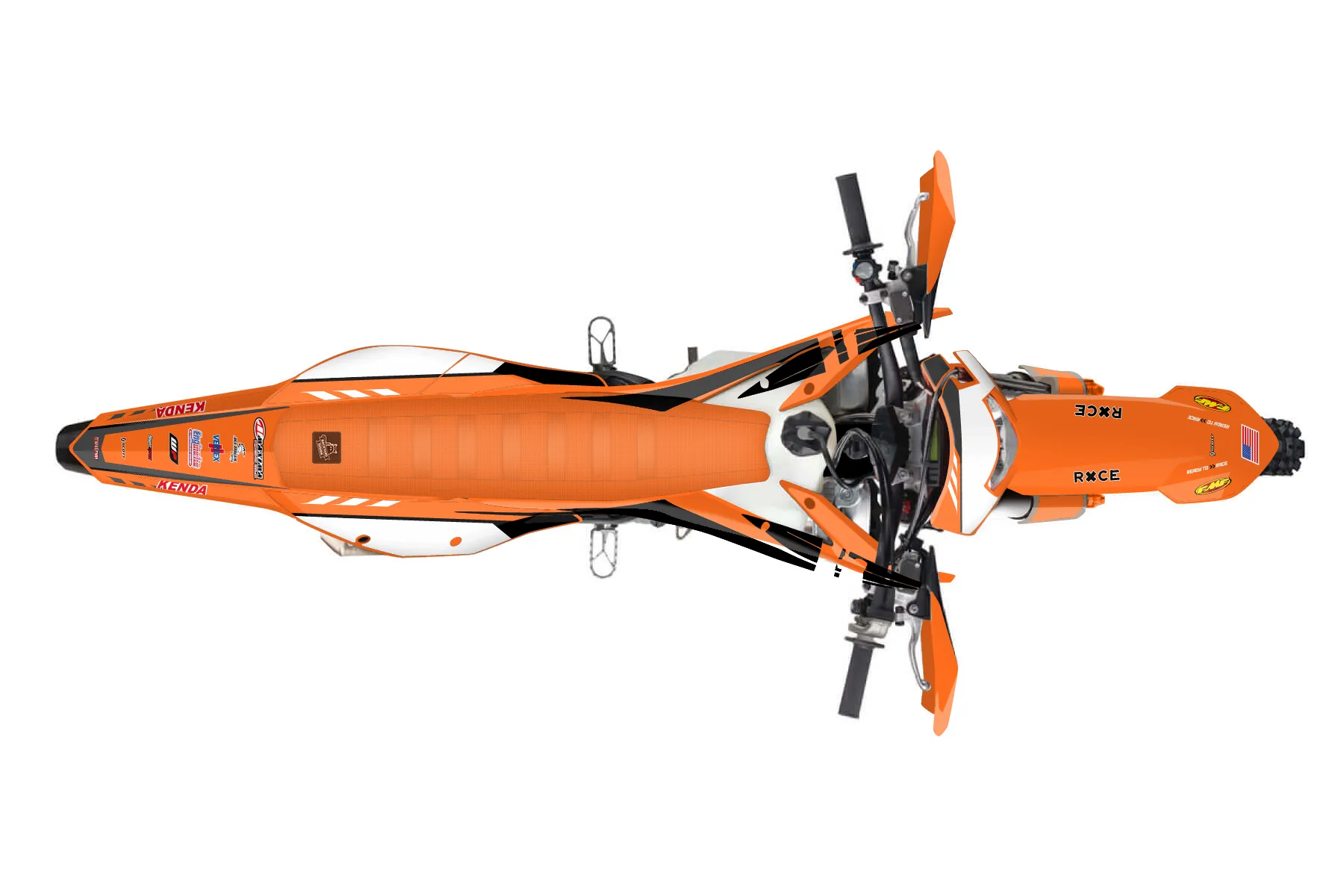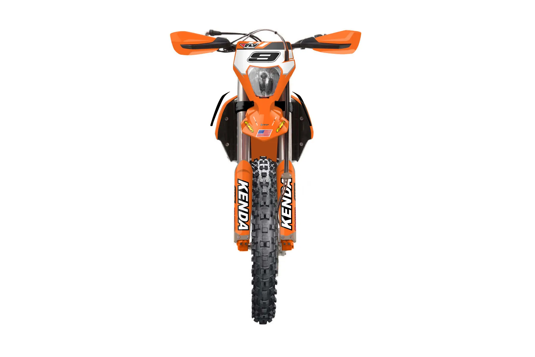 «ktm 500 design» — готовый комплект графики серии Maverick для KTM Enduro Graphic Kit KTM EXC-F 500 2020. В комплекте: графика на бак и боковые облицовки, крылья (переднее и заднее), передний щиток, номерные таблички, защита вилки. Материал: ПВХ-винил 80 мкр с холодной ламинацией 300 мкр, общая толщина 380 мкр; покрытие глянцевое или матовое на выбор. Устойчив к UV-излучению, воде, бензину и мойке высокого давления. Клей акриловый на сольвентной основе — постоянный, для гибких пластиков. На простых поверхностях монтируется без нагрева; для сложных изгибов рекомендуем фен. Этот пресет можно заказать как есть или взять за основу в конструкторе: поменять цвета, добавить стартовый номер и свой бренд. Производство — 3–5 рабочих дней, доставка по России СДЭКом или Почтой, по СНГ — курьерскими службами.