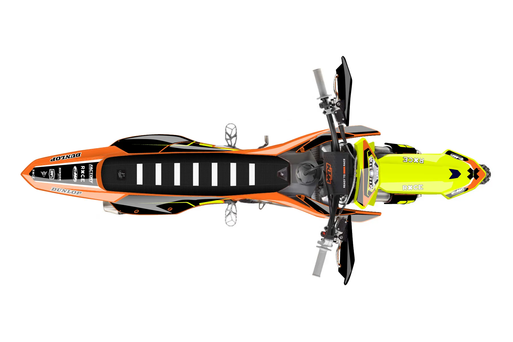 «Fluorescent» — готовый комплект графики серии Flow для KTM Enduro Graphic Kit KTM EXC-F 500 2024. В комплекте: графика на бак и боковые облицовки, крылья (переднее и заднее), передний щиток, номерные таблички, защита вилки. Материал: ПВХ-винил 80 мкр с холодной ламинацией 300 мкр, общая толщина 380 мкр; покрытие глянцевое или матовое на выбор. Устойчив к UV-излучению, воде, бензину и мойке высокого давления. Клей акриловый на сольвентной основе — постоянный, для гибких пластиков. На простых поверхностях монтируется без нагрева; для сложных изгибов рекомендуем фен. Этот пресет можно заказать как есть или взять за основу в конструкторе: поменять цвета, добавить стартовый номер и свой бренд. Производство — 3–5 рабочих дней, доставка по России СДЭКом или Почтой, по СНГ — курьерскими службами.