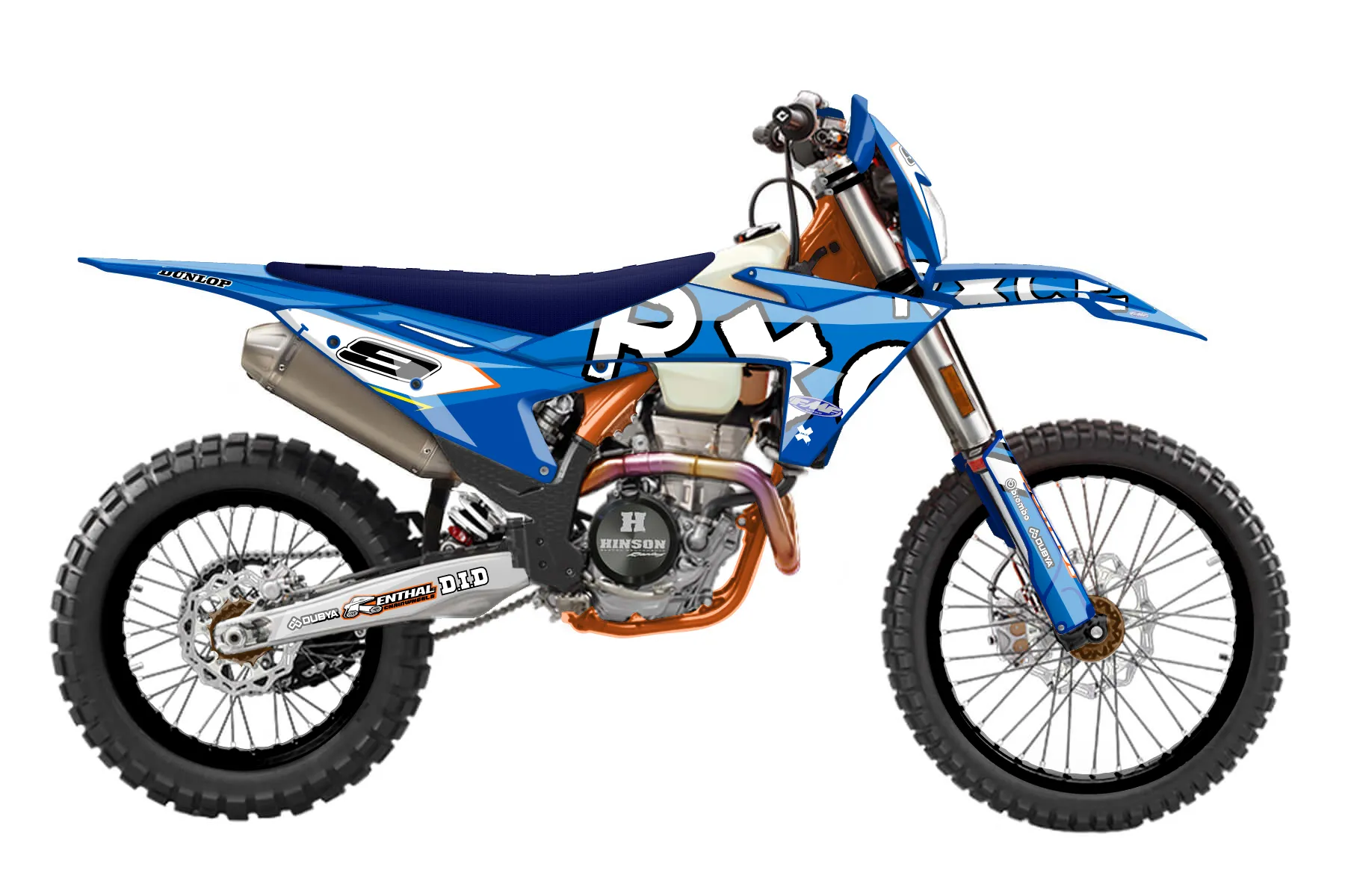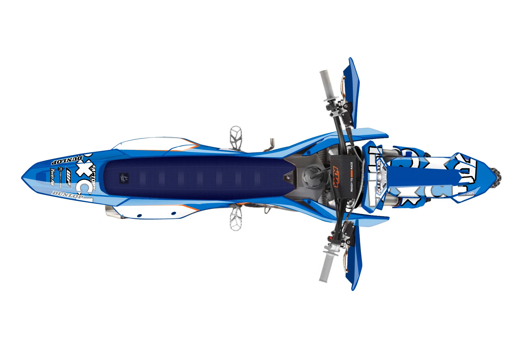 «NRG 500 EXC» — готовый комплект графики серии Staple для KTM Enduro Graphic Kit KTM EXC-F 500 2024. В комплекте: графика на бак и боковые облицовки, крылья (переднее и заднее), передний щиток, номерные таблички, защита вилки. Материал: ПВХ-винил 80 мкр с холодной ламинацией 300 мкр, общая толщина 380 мкр; покрытие глянцевое или матовое на выбор. Устойчив к UV-излучению, воде, бензину и мойке высокого давления. Клей акриловый на сольвентной основе — постоянный, для гибких пластиков. На простых поверхностях монтируется без нагрева; для сложных изгибов рекомендуем фен. Этот пресет можно заказать как есть или взять за основу в конструкторе: поменять цвета, добавить стартовый номер и свой бренд. Производство — 3–5 рабочих дней, доставка по России СДЭКом или Почтой, по СНГ — курьерскими службами.