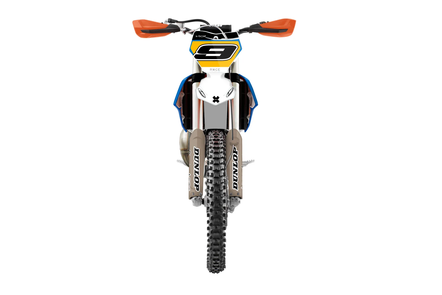 «All-Star» — готовый комплект графики серии Flow для KTM Offroad Graphic Kit KTM XC 125 2019. В комплекте: графика на бак и боковые облицовки, крылья (переднее и заднее), передний щиток, номерные таблички, защита вилки. Материал: ПВХ-винил 80 мкр с холодной ламинацией 300 мкр, общая толщина 380 мкр; покрытие глянцевое или матовое на выбор. Устойчив к UV-излучению, воде, бензину и мойке высокого давления. Клей акриловый на сольвентной основе — постоянный, для гибких пластиков. На простых поверхностях монтируется без нагрева; для сложных изгибов рекомендуем фен. Этот пресет можно заказать как есть или взять за основу в конструкторе: поменять цвета, добавить стартовый номер и свой бренд. Производство — 3–5 рабочих дней, доставка по России СДЭКом или Почтой, по СНГ — курьерскими службами.