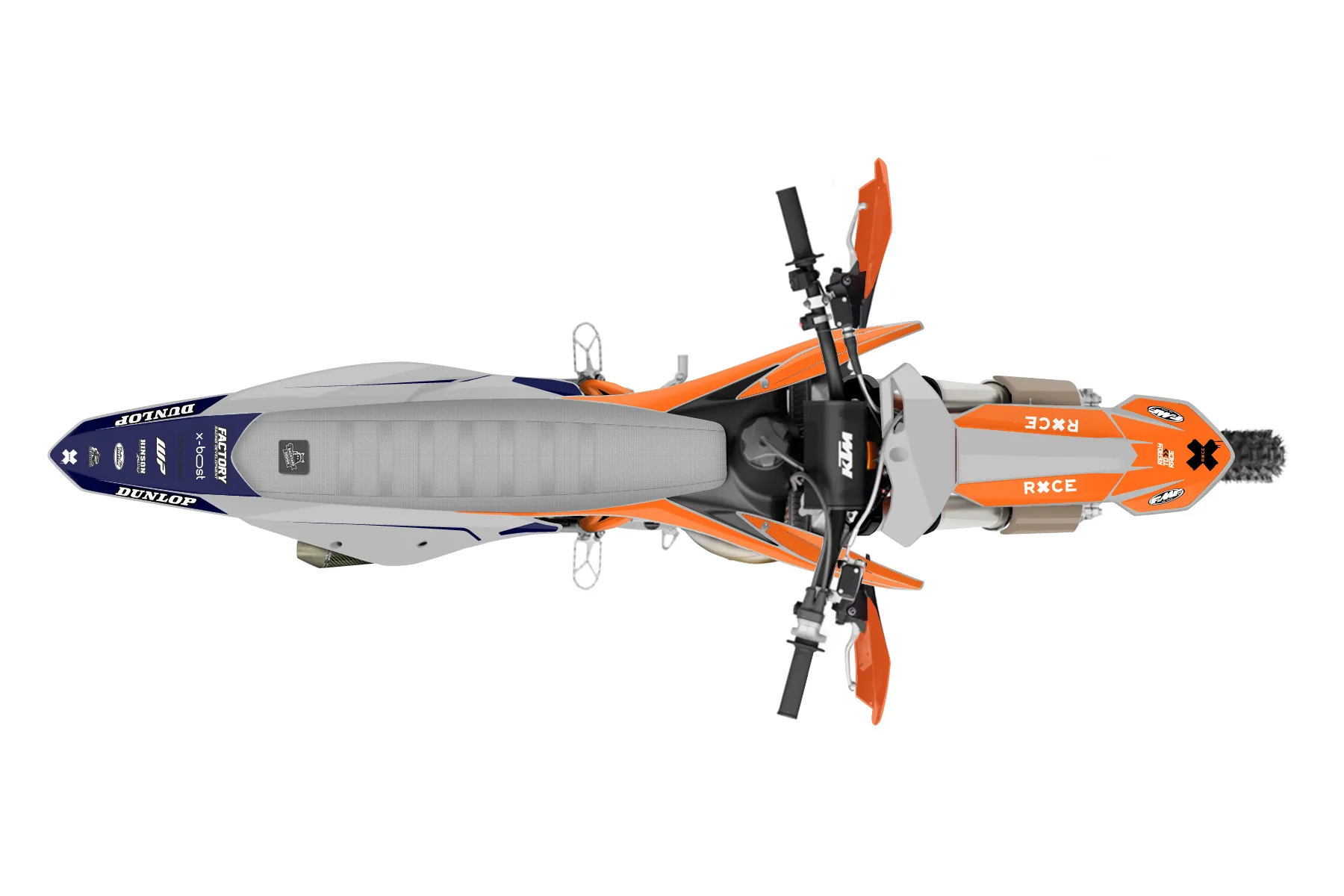 «Ride» — готовый комплект графики серии Flow для KTM Offroad Graphic Kit KTM XC 125 2019. В комплекте: графика на бак и боковые облицовки, крылья (переднее и заднее), передний щиток, номерные таблички, защита вилки. Материал: ПВХ-винил 80 мкр с холодной ламинацией 300 мкр, общая толщина 380 мкр; покрытие глянцевое или матовое на выбор. Устойчив к UV-излучению, воде, бензину и мойке высокого давления. Клей акриловый на сольвентной основе — постоянный, для гибких пластиков. На простых поверхностях монтируется без нагрева; для сложных изгибов рекомендуем фен. Этот пресет можно заказать как есть или взять за основу в конструкторе: поменять цвета, добавить стартовый номер и свой бренд. Производство — 3–5 рабочих дней, доставка по России СДЭКом или Почтой, по СНГ — курьерскими службами.