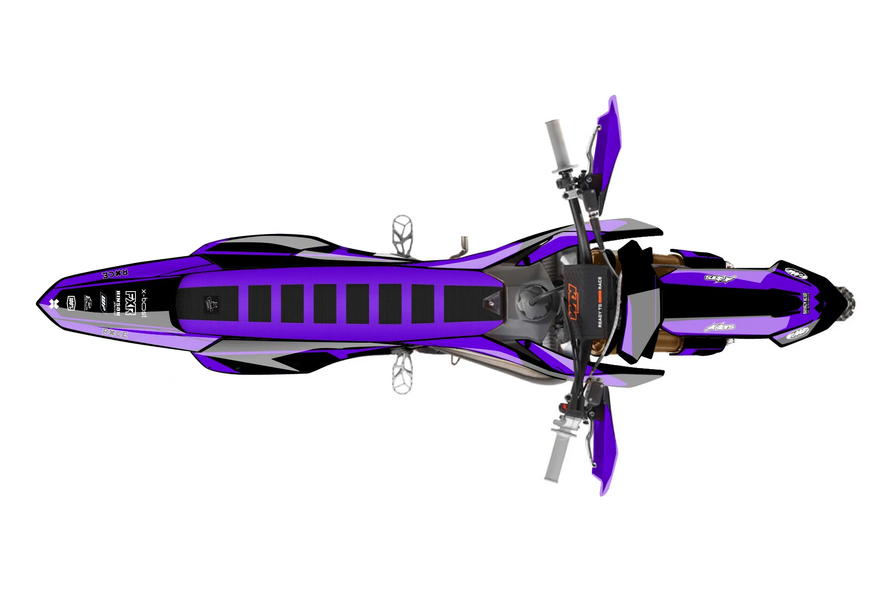 «purple black » — готовый комплект графики серии Flow для KTM Offroad Graphic Kit KTM XC 125 2023. В комплекте: графика на бак и боковые облицовки, крылья (переднее и заднее), передний щиток, номерные таблички, защита вилки. Материал: ПВХ-винил 80 мкр с холодной ламинацией 300 мкр, общая толщина 380 мкр; покрытие глянцевое или матовое на выбор. Устойчив к UV-излучению, воде, бензину и мойке высокого давления. Клей акриловый на сольвентной основе — постоянный, для гибких пластиков. На простых поверхностях монтируется без нагрева; для сложных изгибов рекомендуем фен. Этот пресет можно заказать как есть или взять за основу в конструкторе: поменять цвета, добавить стартовый номер и свой бренд. Производство — 3–5 рабочих дней, доставка по России СДЭКом или Почтой, по СНГ — курьерскими службами.