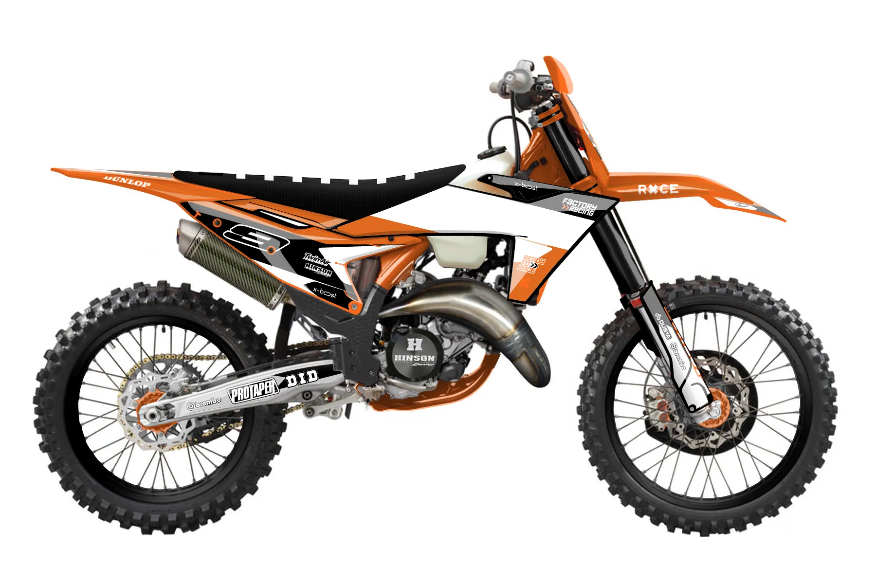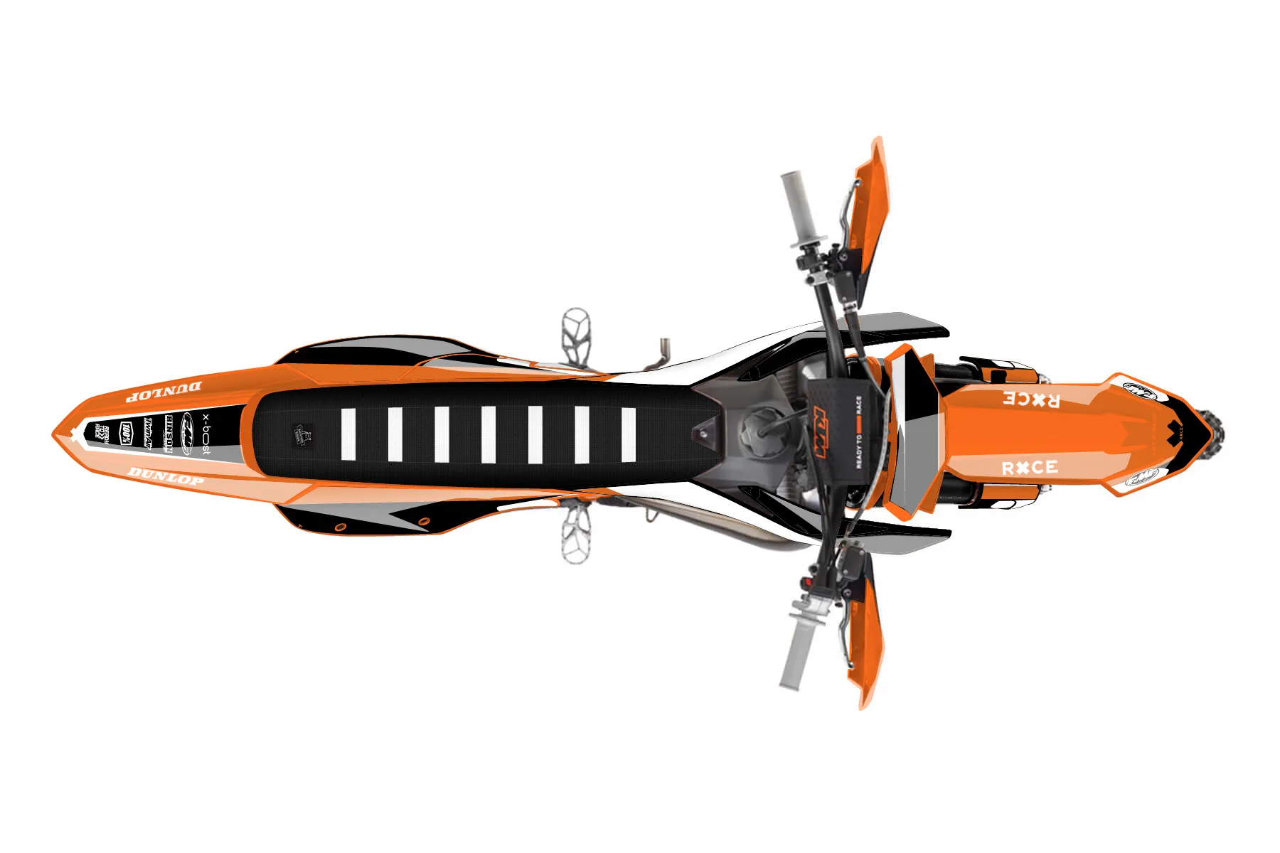 «Race» — готовый комплект графики серии Flow для KTM Offroad Graphic Kit KTM XC 125 2023. В комплекте: графика на бак и боковые облицовки, крылья (переднее и заднее), передний щиток, номерные таблички, защита вилки. Материал: ПВХ-винил 80 мкр с холодной ламинацией 300 мкр, общая толщина 380 мкр; покрытие глянцевое или матовое на выбор. Устойчив к UV-излучению, воде, бензину и мойке высокого давления. Клей акриловый на сольвентной основе — постоянный, для гибких пластиков. На простых поверхностях монтируется без нагрева; для сложных изгибов рекомендуем фен. Этот пресет можно заказать как есть или взять за основу в конструкторе: поменять цвета, добавить стартовый номер и свой бренд. Производство — 3–5 рабочих дней, доставка по России СДЭКом или Почтой, по СНГ — курьерскими службами.
