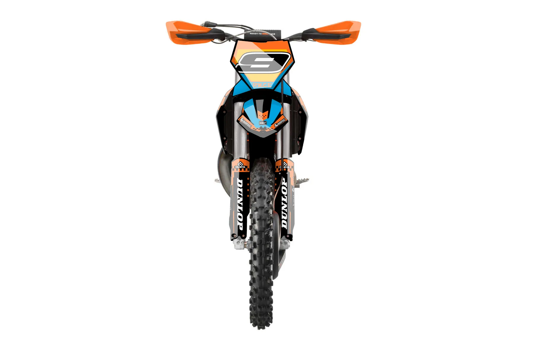 «KTM 125xc Orange» — готовый комплект графики серии Staple для KTM Offroad Graphic Kit KTM XC 125 2023. В комплекте: графика на бак и боковые облицовки, крылья (переднее и заднее), передний щиток, номерные таблички, защита вилки. Материал: ПВХ-винил 80 мкр с холодной ламинацией 300 мкр, общая толщина 380 мкр; покрытие глянцевое или матовое на выбор. Устойчив к UV-излучению, воде, бензину и мойке высокого давления. Клей акриловый на сольвентной основе — постоянный, для гибких пластиков. На простых поверхностях монтируется без нагрева; для сложных изгибов рекомендуем фен. Этот пресет можно заказать как есть или взять за основу в конструкторе: поменять цвета, добавить стартовый номер и свой бренд. Производство — 3–5 рабочих дней, доставка по России СДЭКом или Почтой, по СНГ — курьерскими службами.