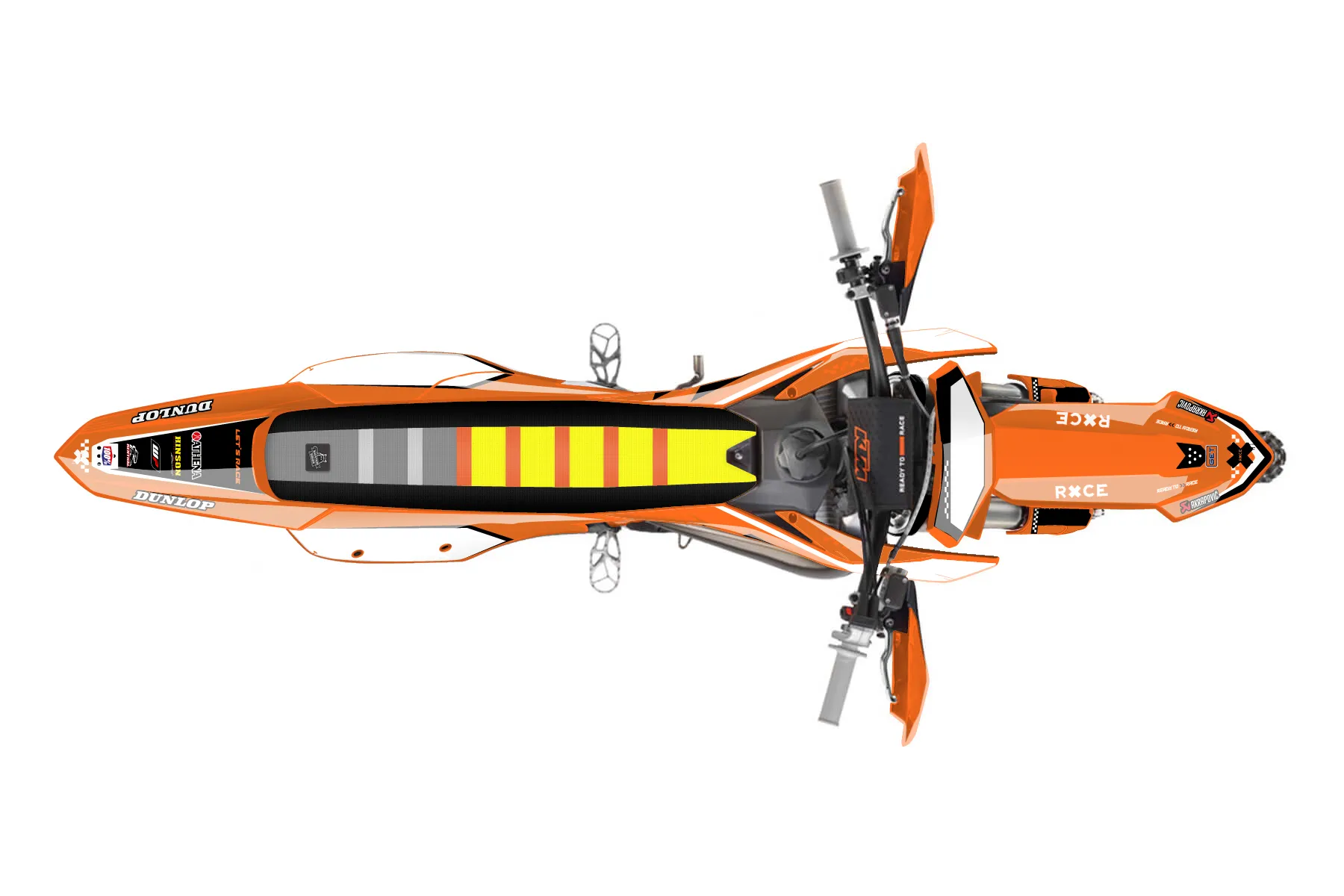 «Raw» — готовый комплект графики серии Staple для KTM Offroad Graphic Kit KTM XC 125 2023. В комплекте: графика на бак и боковые облицовки, крылья (переднее и заднее), передний щиток, номерные таблички, защита вилки. Материал: ПВХ-винил 80 мкр с холодной ламинацией 300 мкр, общая толщина 380 мкр; покрытие глянцевое или матовое на выбор. Устойчив к UV-излучению, воде, бензину и мойке высокого давления. Клей акриловый на сольвентной основе — постоянный, для гибких пластиков. На простых поверхностях монтируется без нагрева; для сложных изгибов рекомендуем фен. Этот пресет можно заказать как есть или взять за основу в конструкторе: поменять цвета, добавить стартовый номер и свой бренд. Производство — 3–5 рабочих дней, доставка по России СДЭКом или Почтой, по СНГ — курьерскими службами.