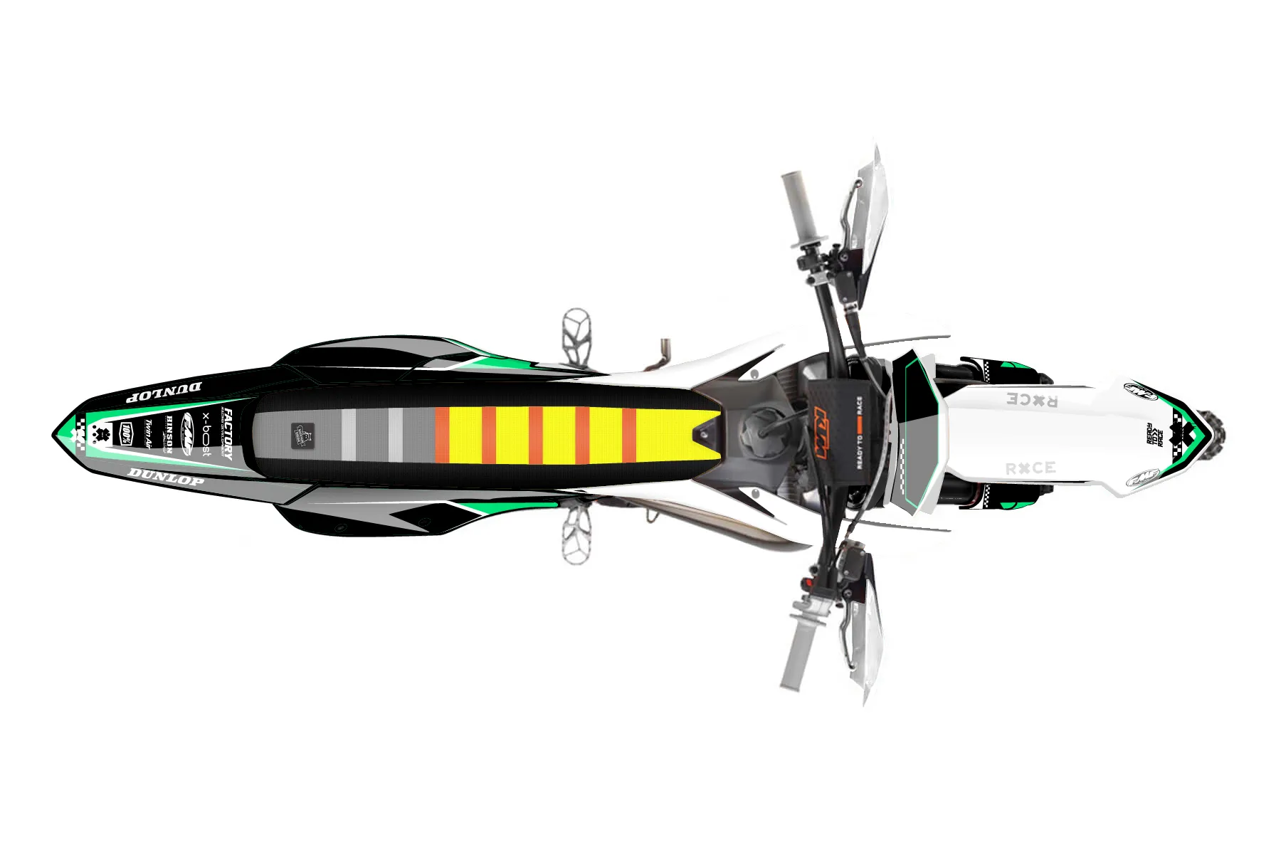 «Supervision» — готовый комплект графики серии Staple для KTM Offroad Graphic Kit KTM XC 125 2023. В комплекте: графика на бак и боковые облицовки, крылья (переднее и заднее), передний щиток, номерные таблички, защита вилки. Материал: ПВХ-винил 80 мкр с холодной ламинацией 300 мкр, общая толщина 380 мкр; покрытие глянцевое или матовое на выбор. Устойчив к UV-излучению, воде, бензину и мойке высокого давления. Клей акриловый на сольвентной основе — постоянный, для гибких пластиков. На простых поверхностях монтируется без нагрева; для сложных изгибов рекомендуем фен. Этот пресет можно заказать как есть или взять за основу в конструкторе: поменять цвета, добавить стартовый номер и свой бренд. Производство — 3–5 рабочих дней, доставка по России СДЭКом или Почтой, по СНГ — курьерскими службами.