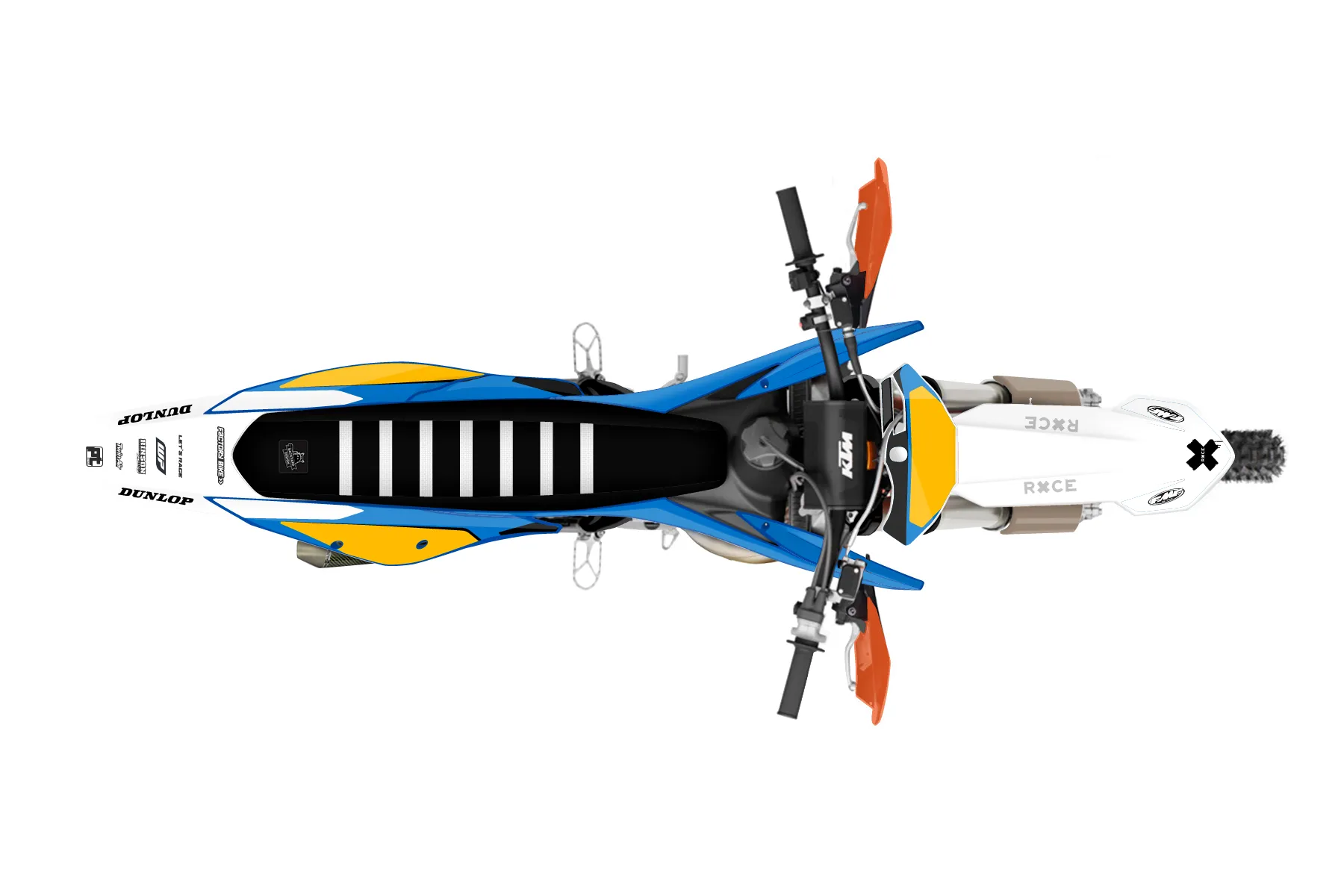 «All-Star» — готовый комплект графики серии Flow для KTM Offroad Graphic Kit KTM XC 150 2019. В комплекте: графика на бак и боковые облицовки, крылья (переднее и заднее), передний щиток, номерные таблички, защита вилки. Материал: ПВХ-винил 80 мкр с холодной ламинацией 300 мкр, общая толщина 380 мкр; покрытие глянцевое или матовое на выбор. Устойчив к UV-излучению, воде, бензину и мойке высокого давления. Клей акриловый на сольвентной основе — постоянный, для гибких пластиков. На простых поверхностях монтируется без нагрева; для сложных изгибов рекомендуем фен. Этот пресет можно заказать как есть или взять за основу в конструкторе: поменять цвета, добавить стартовый номер и свой бренд. Производство — 3–5 рабочих дней, доставка по России СДЭКом или Почтой, по СНГ — курьерскими службами.