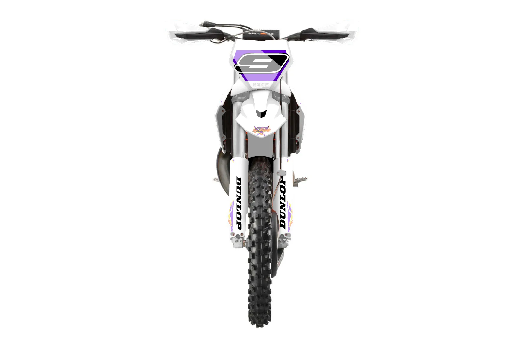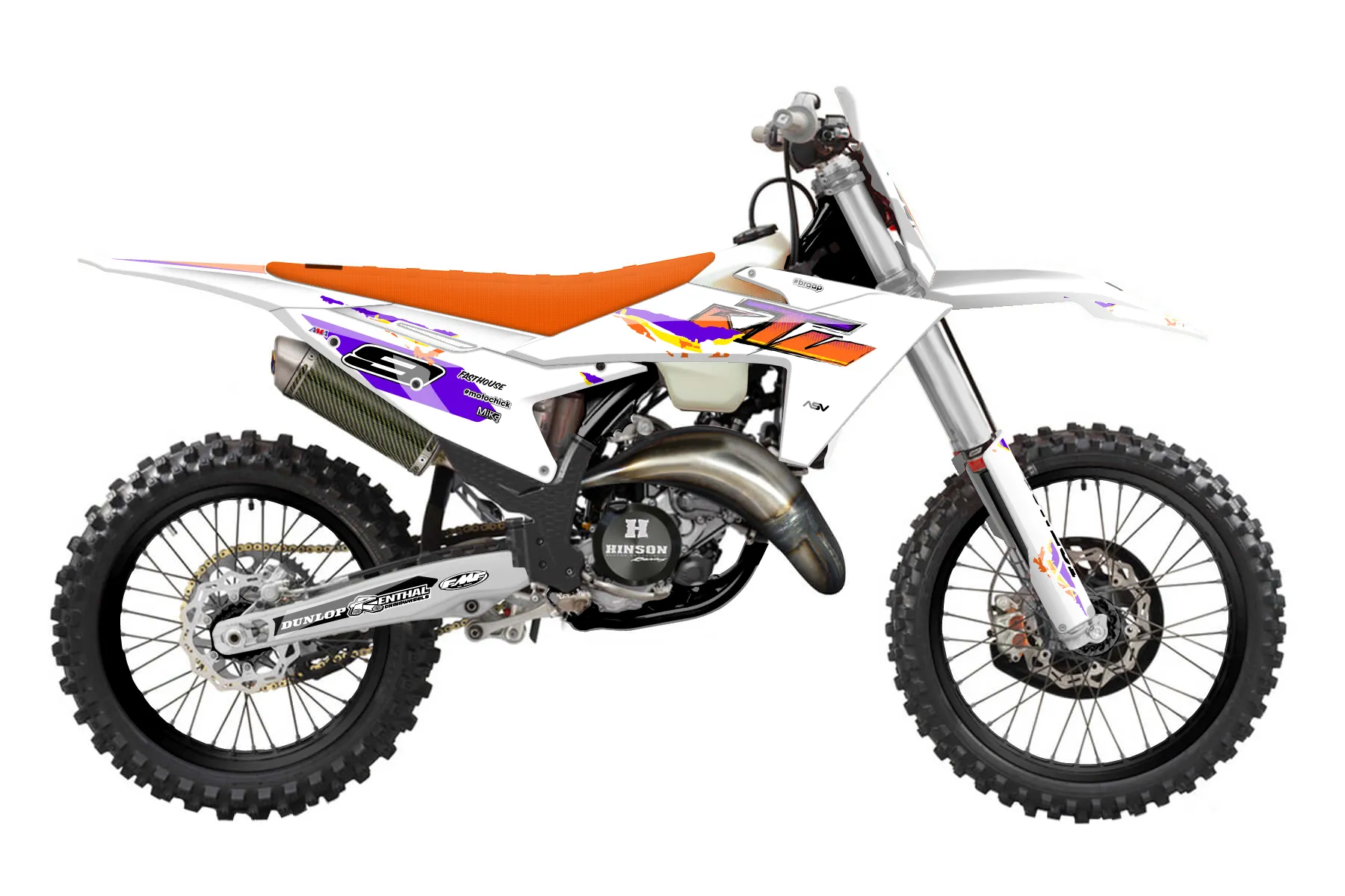 «the CB» — готовый комплект графики серии Flow для KTM Offroad Graphic Kit KTM XC 150 2023. В комплекте: графика на бак и боковые облицовки, крылья (переднее и заднее), передний щиток, номерные таблички, защита вилки. Материал: ПВХ-винил 80 мкр с холодной ламинацией 300 мкр, общая толщина 380 мкр; покрытие глянцевое или матовое на выбор. Устойчив к UV-излучению, воде, бензину и мойке высокого давления. Клей акриловый на сольвентной основе — постоянный, для гибких пластиков. На простых поверхностях монтируется без нагрева; для сложных изгибов рекомендуем фен. Этот пресет можно заказать как есть или взять за основу в конструкторе: поменять цвета, добавить стартовый номер и свой бренд. Производство — 3–5 рабочих дней, доставка по России СДЭКом или Почтой, по СНГ — курьерскими службами.