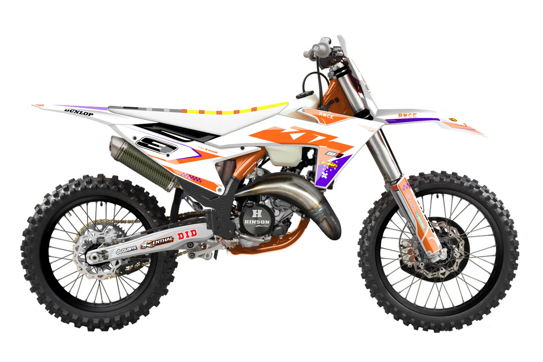 «Retro» — готовый комплект графики серии Staple для KTM Offroad Graphic Kit KTM XC 150 2023. В комплекте: графика на бак и боковые облицовки, крылья (переднее и заднее), передний щиток, номерные таблички, защита вилки. Материал: ПВХ-винил 80 мкр с холодной ламинацией 300 мкр, общая толщина 380 мкр; покрытие глянцевое или матовое на выбор. Устойчив к UV-излучению, воде, бензину и мойке высокого давления. Клей акриловый на сольвентной основе — постоянный, для гибких пластиков. На простых поверхностях монтируется без нагрева; для сложных изгибов рекомендуем фен. Этот пресет можно заказать как есть или взять за основу в конструкторе: поменять цвета, добавить стартовый номер и свой бренд. Производство — 3–5 рабочих дней, доставка по России СДЭКом или Почтой, по СНГ — курьерскими службами.