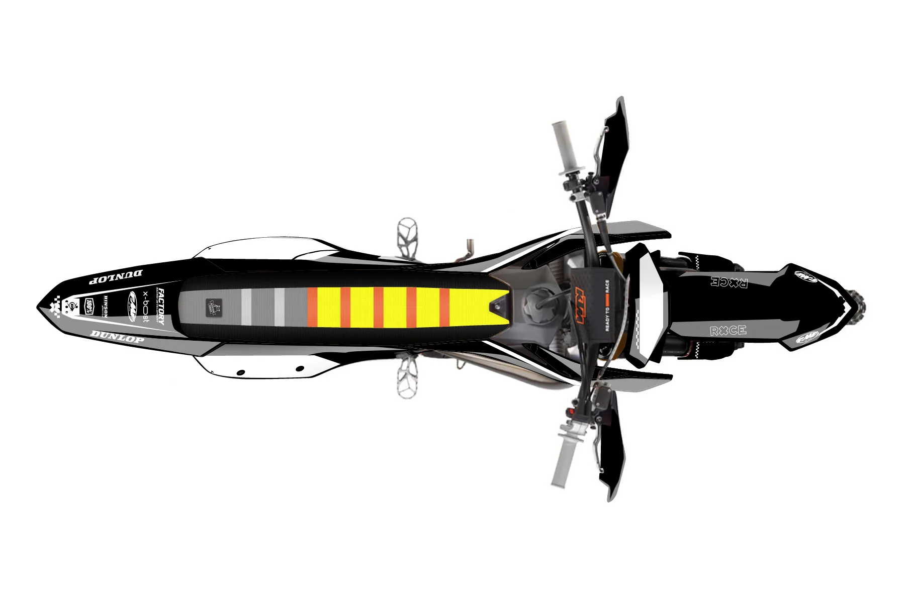 «Ryder» — готовый комплект графики серии Staple для KTM Offroad Graphic Kit KTM XC 150 2023. В комплекте: графика на бак и боковые облицовки, крылья (переднее и заднее), передний щиток, номерные таблички, защита вилки. Материал: ПВХ-винил 80 мкр с холодной ламинацией 300 мкр, общая толщина 380 мкр; покрытие глянцевое или матовое на выбор. Устойчив к UV-излучению, воде, бензину и мойке высокого давления. Клей акриловый на сольвентной основе — постоянный, для гибких пластиков. На простых поверхностях монтируется без нагрева; для сложных изгибов рекомендуем фен. Этот пресет можно заказать как есть или взять за основу в конструкторе: поменять цвета, добавить стартовый номер и свой бренд. Производство — 3–5 рабочих дней, доставка по России СДЭКом или Почтой, по СНГ — курьерскими службами.