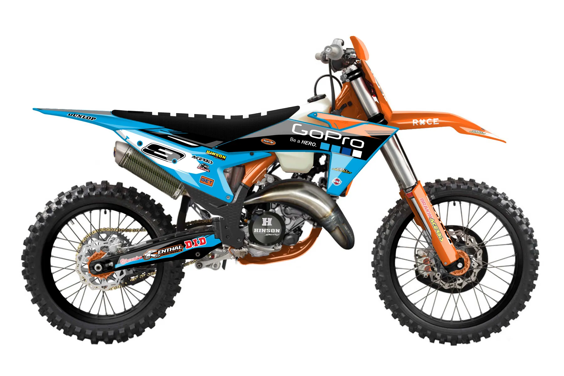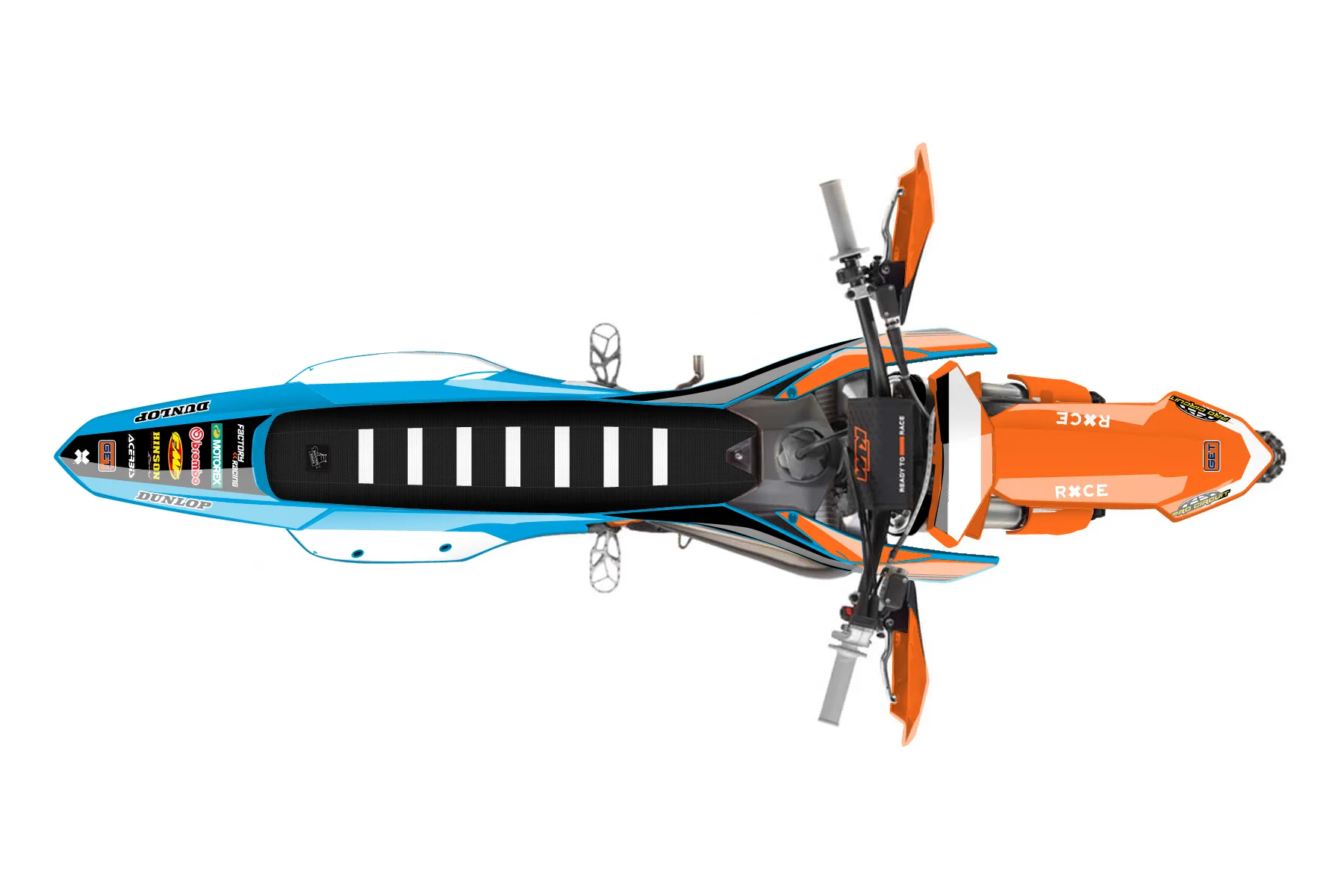 «KTM GOPRO 150» — готовый комплект графики серии Untucked для KTM Offroad Graphic Kit KTM XC 150 2023. В комплекте: графика на бак и боковые облицовки, крылья (переднее и заднее), передний щиток, номерные таблички, защита вилки. Материал: ПВХ-винил 80 мкр с холодной ламинацией 300 мкр, общая толщина 380 мкр; покрытие глянцевое или матовое на выбор. Устойчив к UV-излучению, воде, бензину и мойке высокого давления. Клей акриловый на сольвентной основе — постоянный, для гибких пластиков. На простых поверхностях монтируется без нагрева; для сложных изгибов рекомендуем фен. Этот пресет можно заказать как есть или взять за основу в конструкторе: поменять цвета, добавить стартовый номер и свой бренд. Производство — 3–5 рабочих дней, доставка по России СДЭКом или Почтой, по СНГ — курьерскими службами.