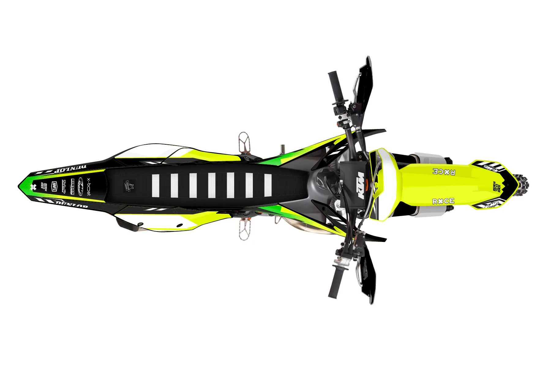 «Volt Neon» — готовый комплект графики серии Maverick для KTM Offroad Graphic Kit KTM XC 250 2016. В комплекте: графика на бак и боковые облицовки, крылья (переднее и заднее), передний щиток, номерные таблички, защита вилки. Материал: ПВХ-винил 80 мкр с холодной ламинацией 300 мкр, общая толщина 380 мкр; покрытие глянцевое или матовое на выбор. Устойчив к UV-излучению, воде, бензину и мойке высокого давления. Клей акриловый на сольвентной основе — постоянный, для гибких пластиков. На простых поверхностях монтируется без нагрева; для сложных изгибов рекомендуем фен. Этот пресет можно заказать как есть или взять за основу в конструкторе: поменять цвета, добавить стартовый номер и свой бренд. Производство — 3–5 рабочих дней, доставка по России СДЭКом или Почтой, по СНГ — курьерскими службами.