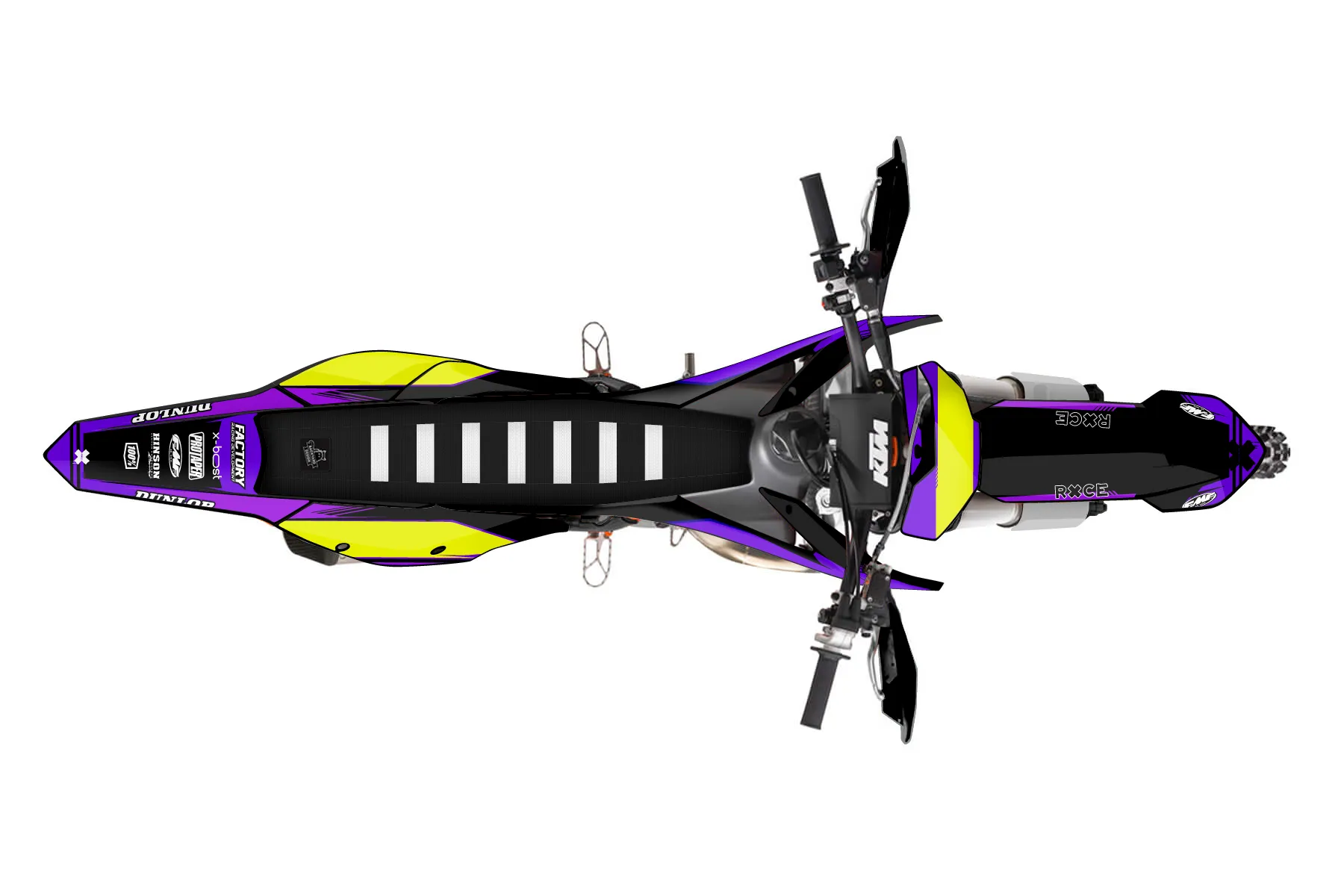 «Purple 2» — готовый комплект графики серии Untucked для KTM Offroad Graphic Kit KTM XC 250 2016. В комплекте: графика на бак и боковые облицовки, крылья (переднее и заднее), передний щиток, номерные таблички, защита вилки. Материал: ПВХ-винил 80 мкр с холодной ламинацией 300 мкр, общая толщина 380 мкр; покрытие глянцевое или матовое на выбор. Устойчив к UV-излучению, воде, бензину и мойке высокого давления. Клей акриловый на сольвентной основе — постоянный, для гибких пластиков. На простых поверхностях монтируется без нагрева; для сложных изгибов рекомендуем фен. Этот пресет можно заказать как есть или взять за основу в конструкторе: поменять цвета, добавить стартовый номер и свой бренд. Производство — 3–5 рабочих дней, доставка по России СДЭКом или Почтой, по СНГ — курьерскими службами.