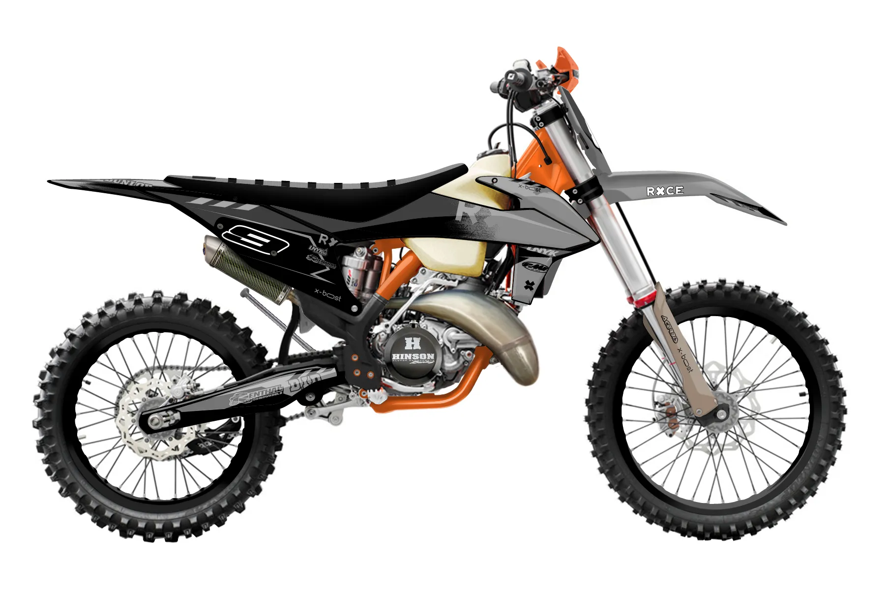 «Grip» — готовый комплект графики серии Maverick для KTM Offroad Graphic Kit KTM XC 250 2019. В комплекте: графика на бак и боковые облицовки, крылья (переднее и заднее), передний щиток, номерные таблички, защита вилки. Материал: ПВХ-винил 80 мкр с холодной ламинацией 300 мкр, общая толщина 380 мкр; покрытие глянцевое или матовое на выбор. Устойчив к UV-излучению, воде, бензину и мойке высокого давления. Клей акриловый на сольвентной основе — постоянный, для гибких пластиков. На простых поверхностях монтируется без нагрева; для сложных изгибов рекомендуем фен. Этот пресет можно заказать как есть или взять за основу в конструкторе: поменять цвета, добавить стартовый номер и свой бренд. Производство — 3–5 рабочих дней, доставка по России СДЭКом или Почтой, по СНГ — курьерскими службами.