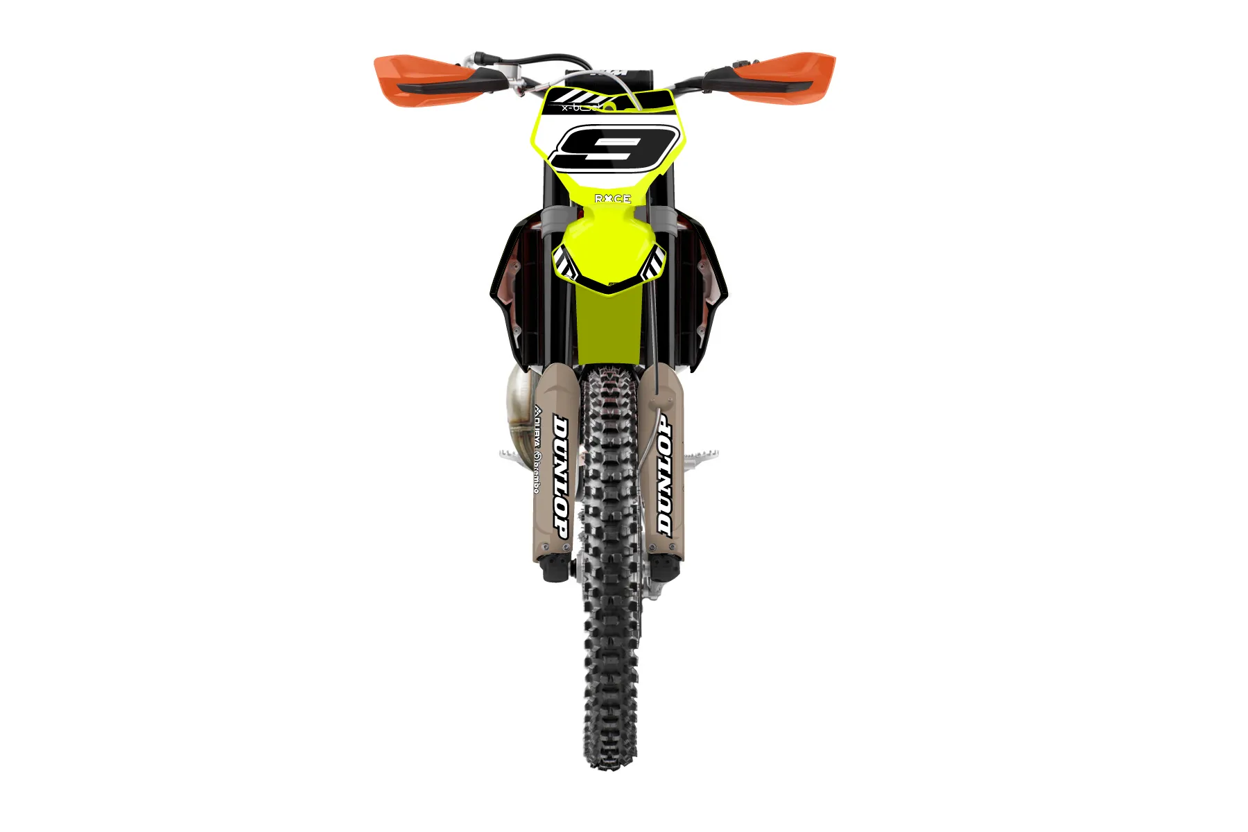 «Volt Neon» — готовый комплект графики серии Maverick для KTM Offroad Graphic Kit KTM XC 250 2019. В комплекте: графика на бак и боковые облицовки, крылья (переднее и заднее), передний щиток, номерные таблички, защита вилки. Материал: ПВХ-винил 80 мкр с холодной ламинацией 300 мкр, общая толщина 380 мкр; покрытие глянцевое или матовое на выбор. Устойчив к UV-излучению, воде, бензину и мойке высокого давления. Клей акриловый на сольвентной основе — постоянный, для гибких пластиков. На простых поверхностях монтируется без нагрева; для сложных изгибов рекомендуем фен. Этот пресет можно заказать как есть или взять за основу в конструкторе: поменять цвета, добавить стартовый номер и свой бренд. Производство — 3–5 рабочих дней, доставка по России СДЭКом или Почтой, по СНГ — курьерскими службами.