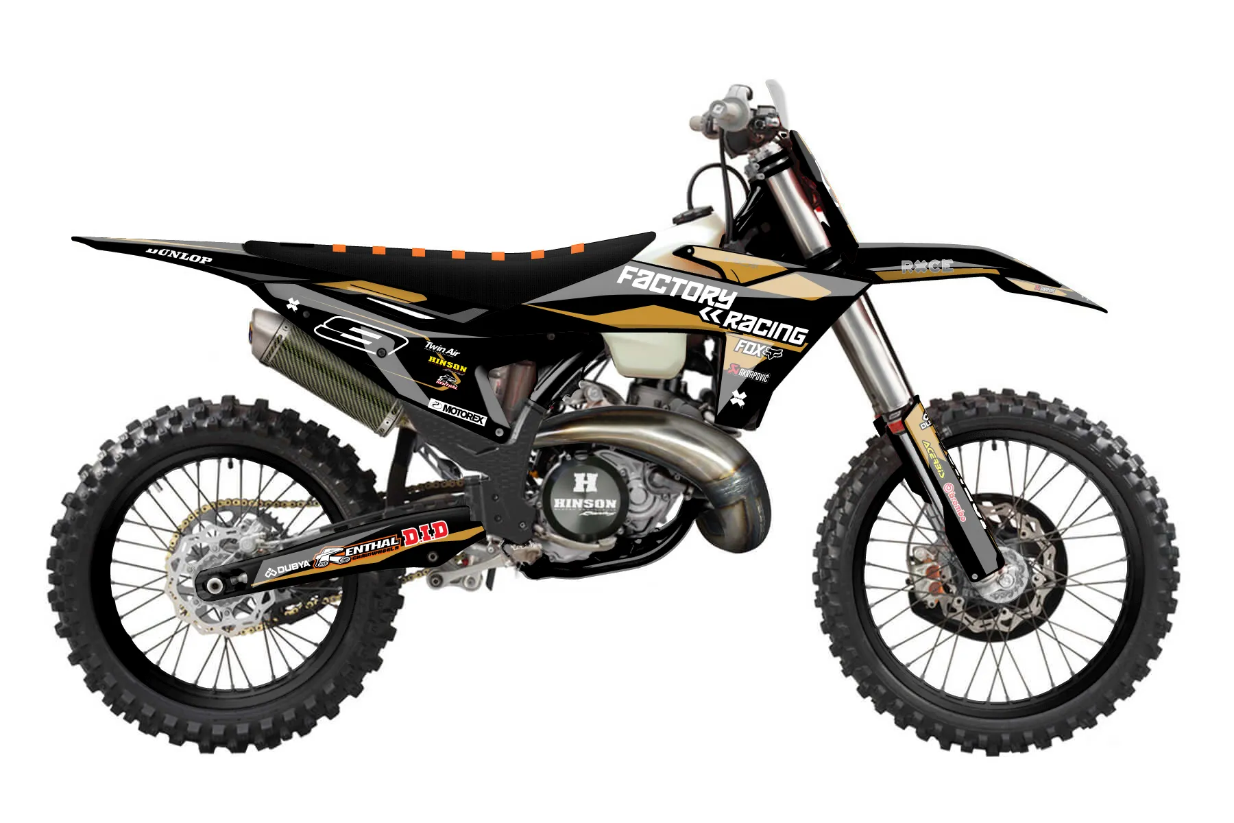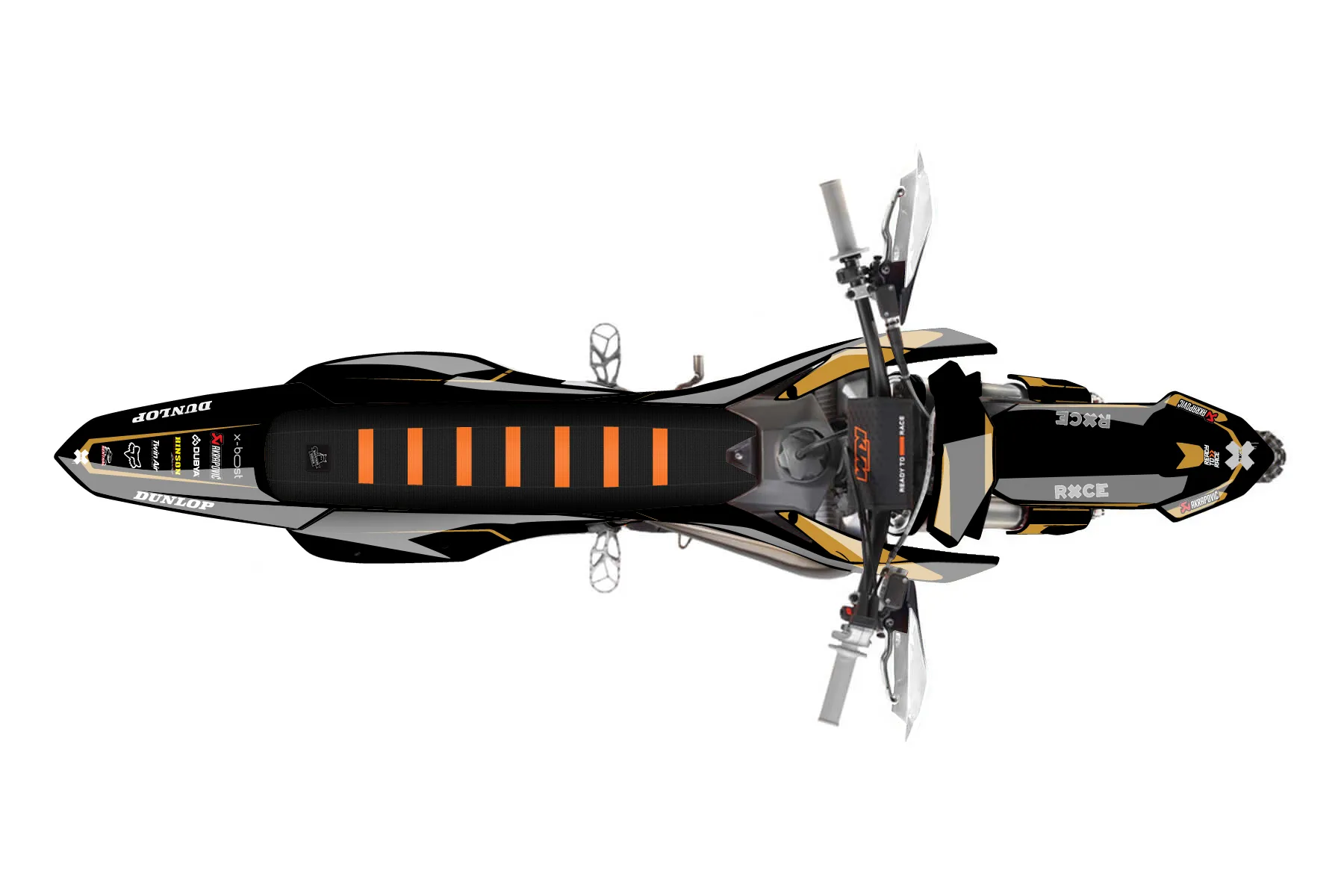 «CustomDesign838» — готовый комплект графики серии Flow для KTM Offroad Graphic Kit KTM XC 250 2023. В комплекте: графика на бак и боковые облицовки, крылья (переднее и заднее), передний щиток, номерные таблички, защита вилки. Материал: ПВХ-винил 80 мкр с холодной ламинацией 300 мкр, общая толщина 380 мкр; покрытие глянцевое или матовое на выбор. Устойчив к UV-излучению, воде, бензину и мойке высокого давления. Клей акриловый на сольвентной основе — постоянный, для гибких пластиков. На простых поверхностях монтируется без нагрева; для сложных изгибов рекомендуем фен. Этот пресет можно заказать как есть или взять за основу в конструкторе: поменять цвета, добавить стартовый номер и свой бренд. Производство — 3–5 рабочих дней, доставка по России СДЭКом или Почтой, по СНГ — курьерскими службами.