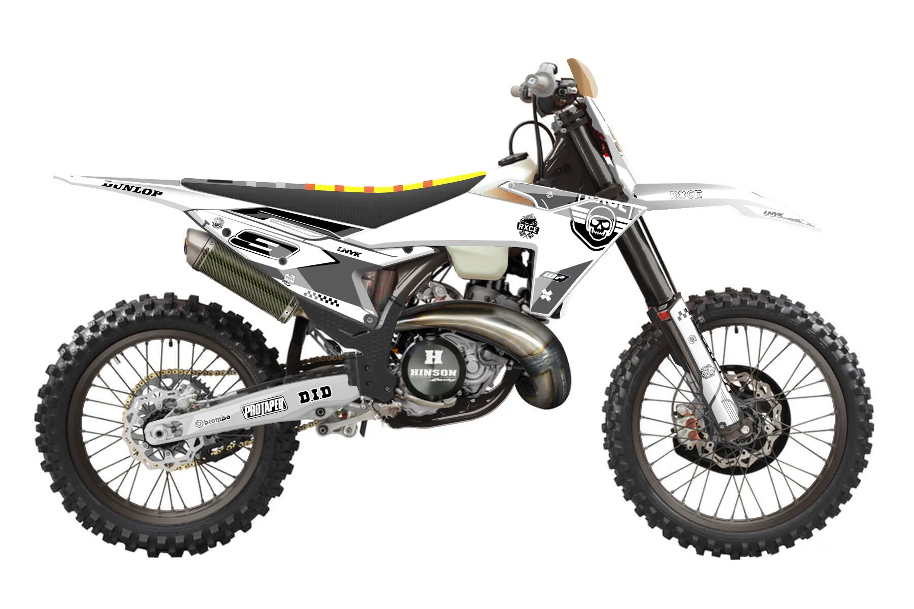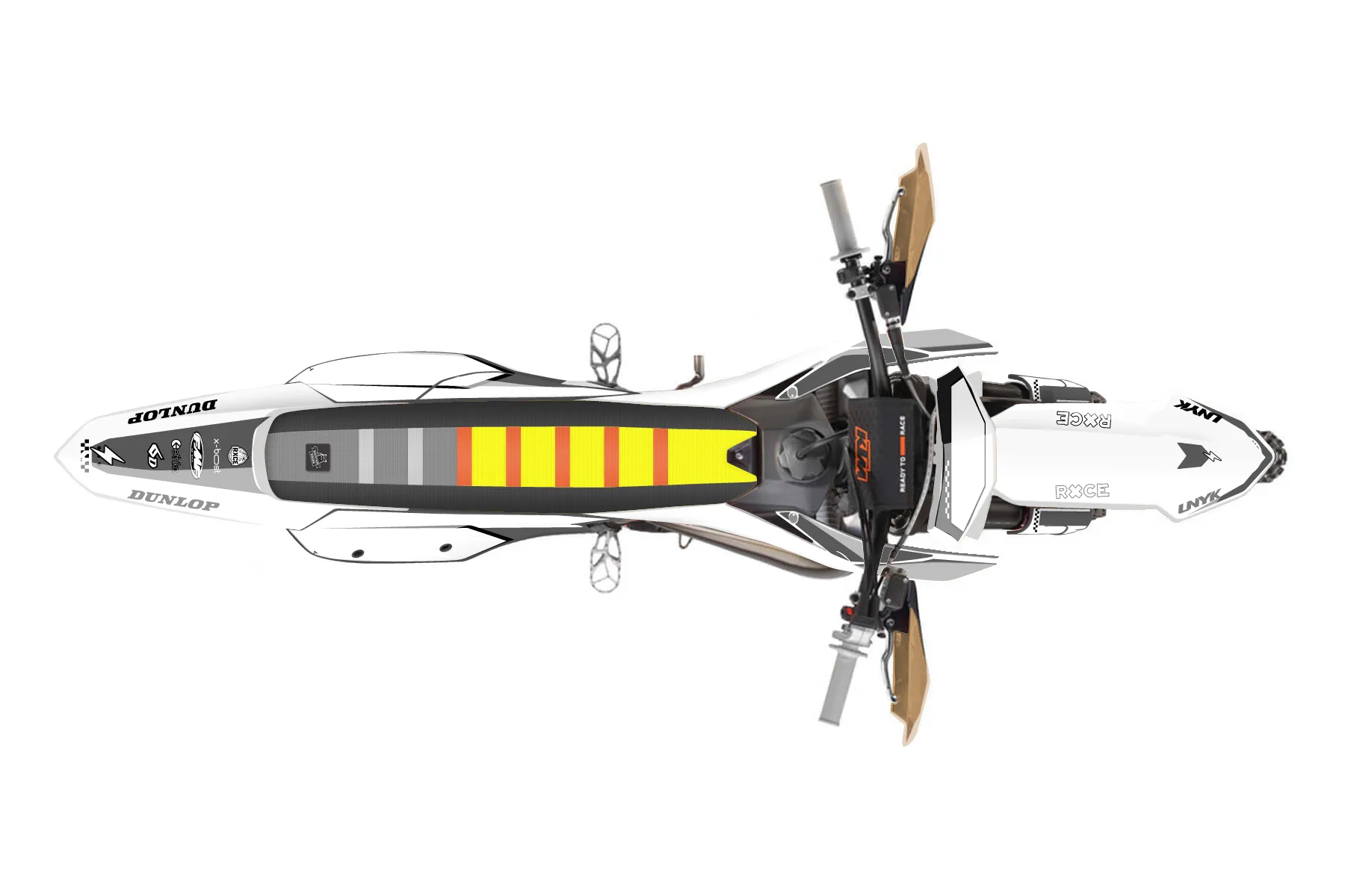 «ktm klakow design» — готовый комплект графики серии Staple для KTM Offroad Graphic Kit KTM XC 250 2023. В комплекте: графика на бак и боковые облицовки, крылья (переднее и заднее), передний щиток, номерные таблички, защита вилки. Материал: ПВХ-винил 80 мкр с холодной ламинацией 300 мкр, общая толщина 380 мкр; покрытие глянцевое или матовое на выбор. Устойчив к UV-излучению, воде, бензину и мойке высокого давления. Клей акриловый на сольвентной основе — постоянный, для гибких пластиков. На простых поверхностях монтируется без нагрева; для сложных изгибов рекомендуем фен. Этот пресет можно заказать как есть или взять за основу в конструкторе: поменять цвета, добавить стартовый номер и свой бренд. Производство — 3–5 рабочих дней, доставка по России СДЭКом или Почтой, по СНГ — курьерскими службами.
