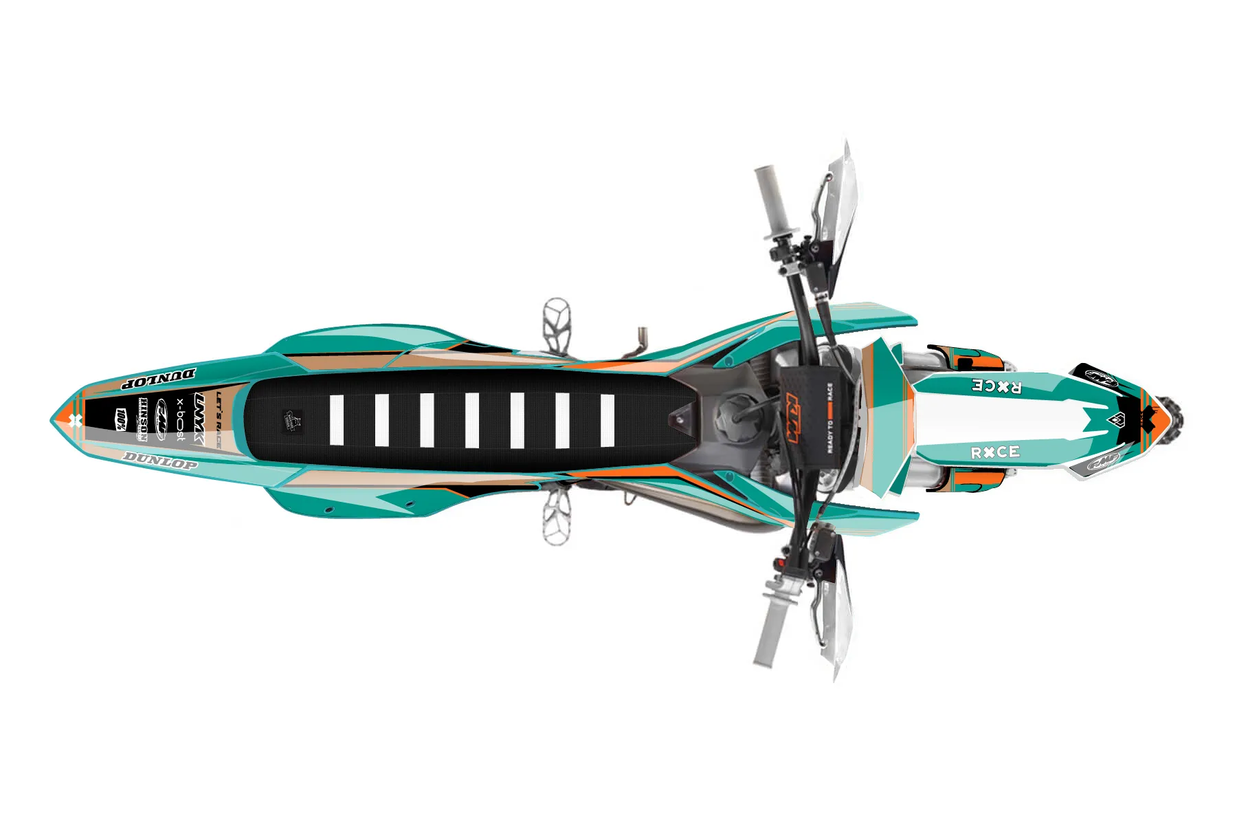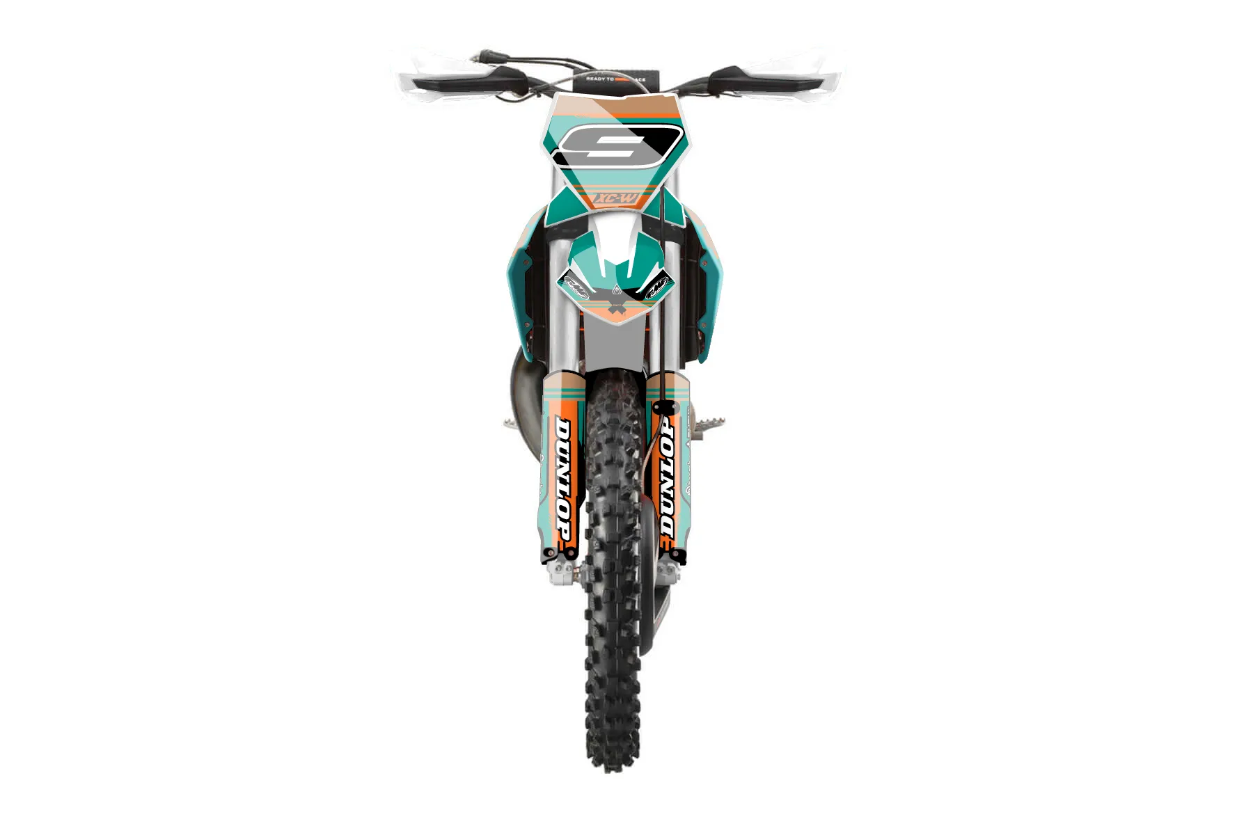 «250xc-w teal terror» — готовый комплект графики серии Untucked для KTM Offroad Graphic Kit KTM XC 250 2023. В комплекте: графика на бак и боковые облицовки, крылья (переднее и заднее), передний щиток, номерные таблички, защита вилки. Материал: ПВХ-винил 80 мкр с холодной ламинацией 300 мкр, общая толщина 380 мкр; покрытие глянцевое или матовое на выбор. Устойчив к UV-излучению, воде, бензину и мойке высокого давления. Клей акриловый на сольвентной основе — постоянный, для гибких пластиков. На простых поверхностях монтируется без нагрева; для сложных изгибов рекомендуем фен. Этот пресет можно заказать как есть или взять за основу в конструкторе: поменять цвета, добавить стартовый номер и свой бренд. Производство — 3–5 рабочих дней, доставка по России СДЭКом или Почтой, по СНГ — курьерскими службами.