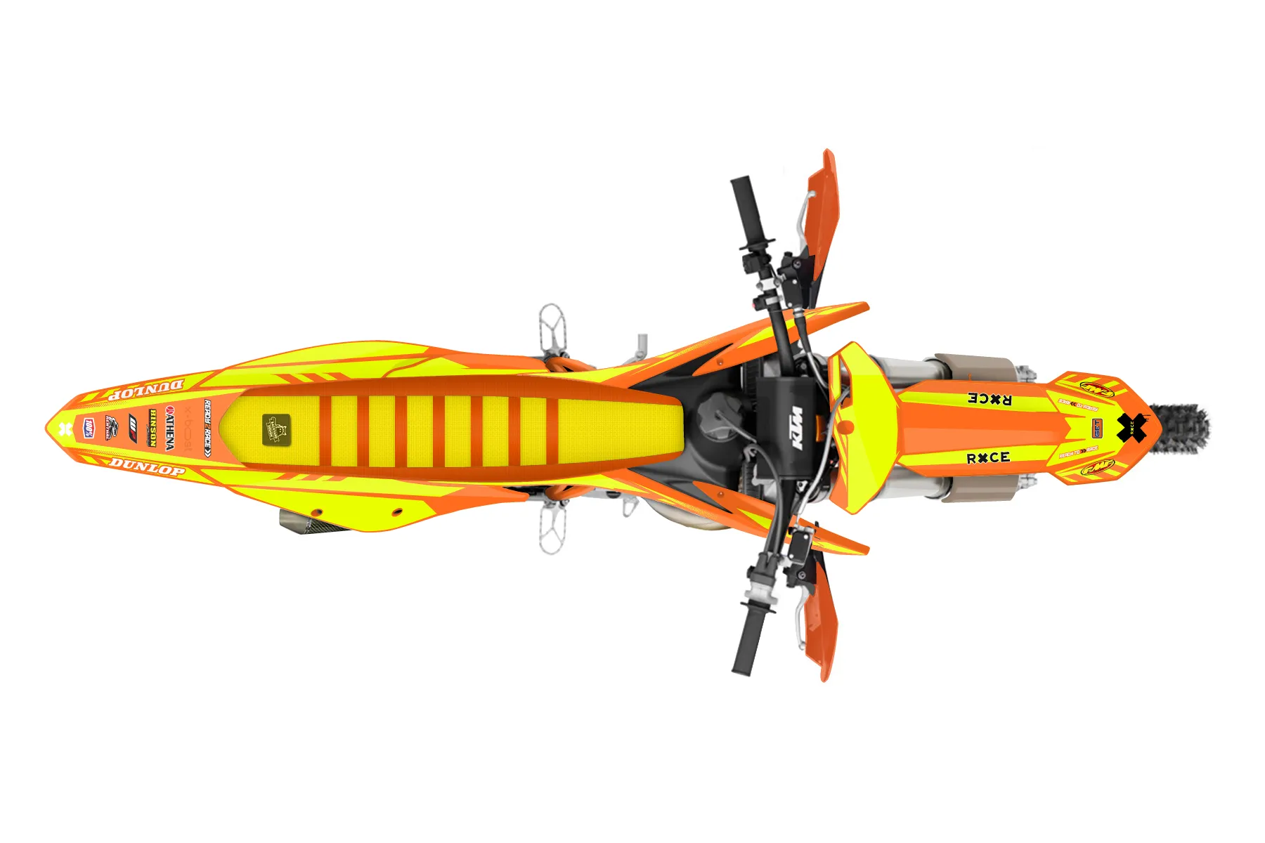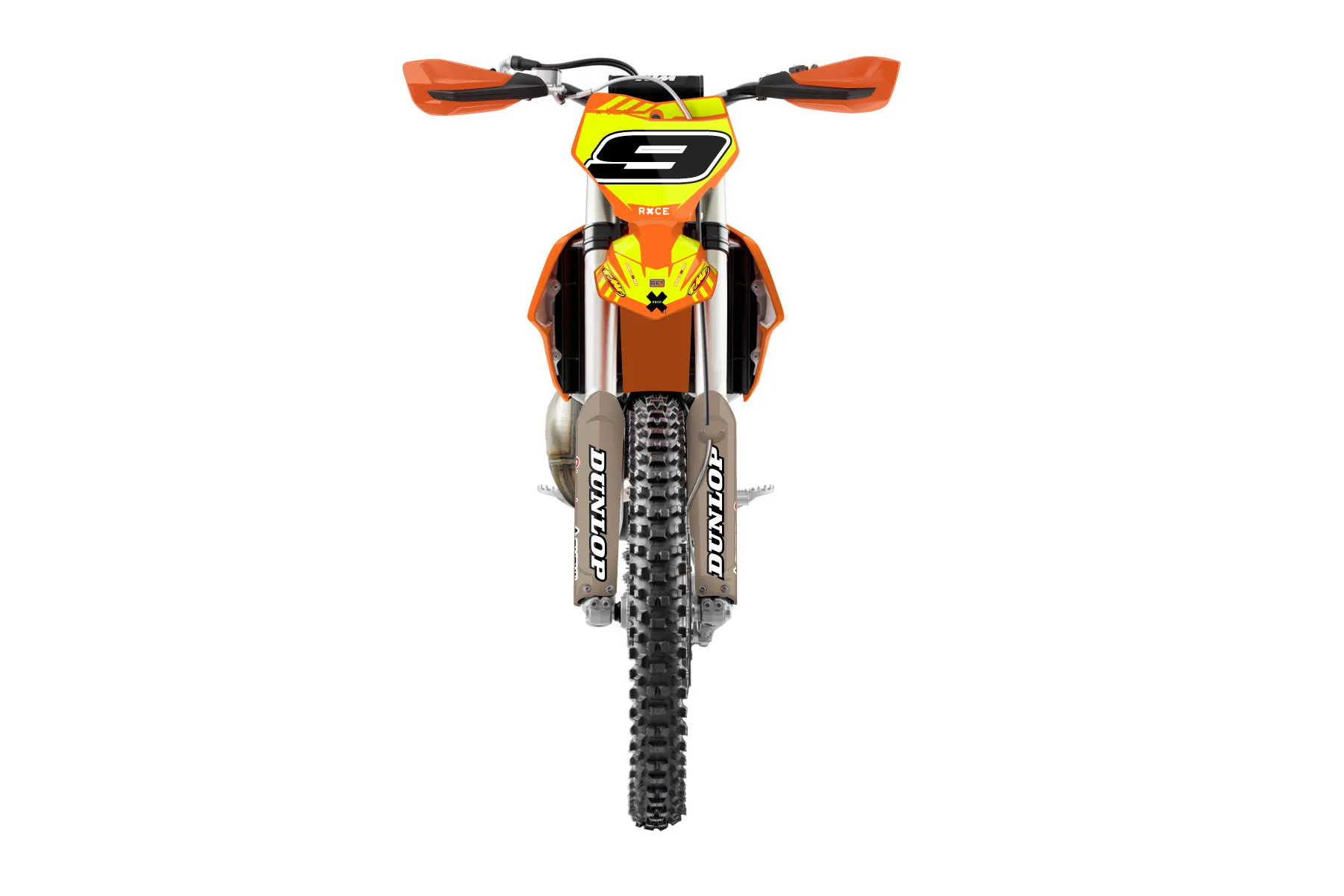 «Yellow ktm» — готовый комплект графики серии Maverick для KTM Offroad Graphic Kit KTM XC 300 2019. В комплекте: графика на бак и боковые облицовки, крылья (переднее и заднее), передний щиток, номерные таблички, защита вилки. Материал: ПВХ-винил 80 мкр с холодной ламинацией 300 мкр, общая толщина 380 мкр; покрытие глянцевое или матовое на выбор. Устойчив к UV-излучению, воде, бензину и мойке высокого давления. Клей акриловый на сольвентной основе — постоянный, для гибких пластиков. На простых поверхностях монтируется без нагрева; для сложных изгибов рекомендуем фен. Этот пресет можно заказать как есть или взять за основу в конструкторе: поменять цвета, добавить стартовый номер и свой бренд. Производство — 3–5 рабочих дней, доставка по России СДЭКом или Почтой, по СНГ — курьерскими службами.