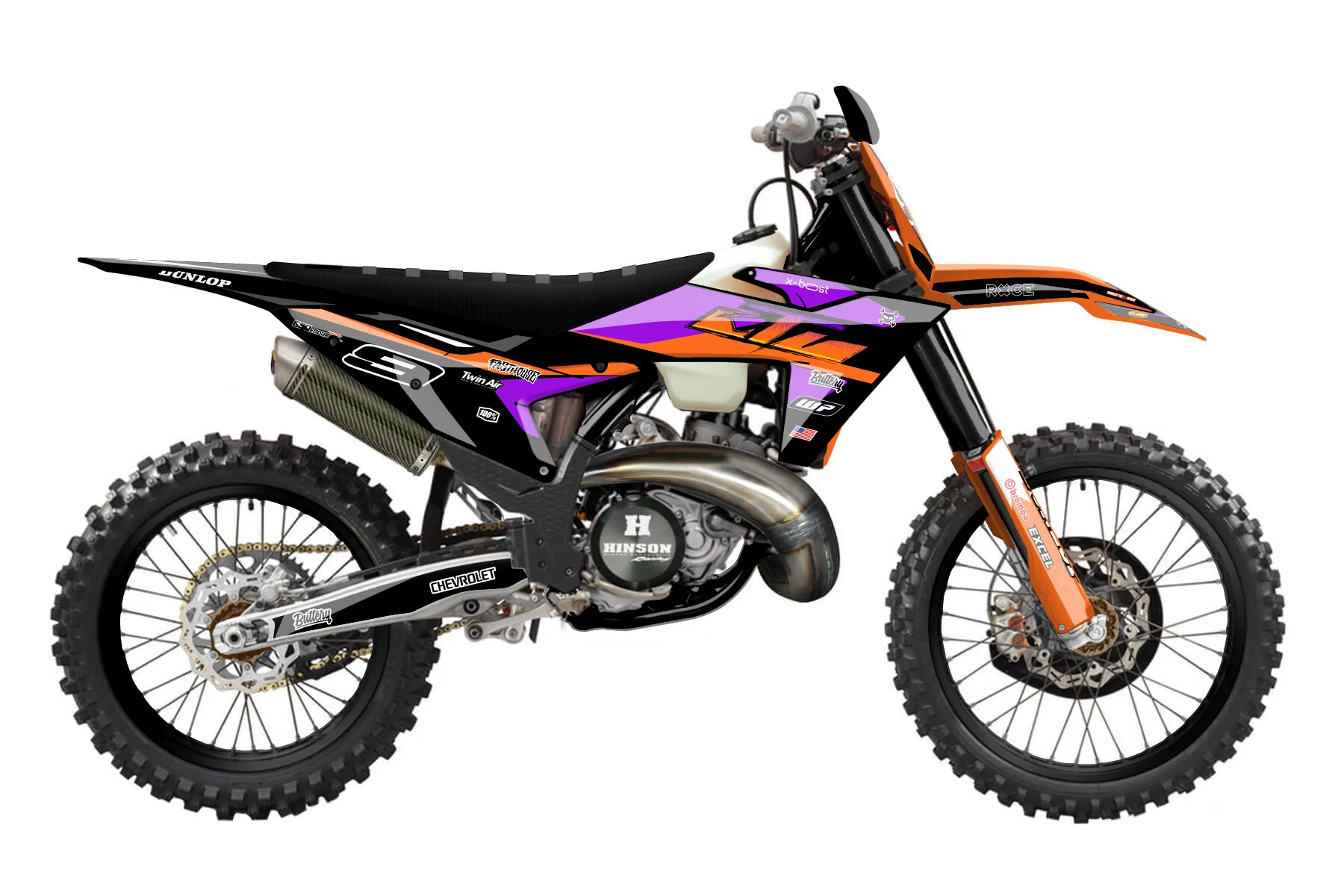 «Chevy palm» — готовый комплект графики серии Flow для KTM Offroad Graphic Kit KTM XC 300 2023. В комплекте: графика на бак и боковые облицовки, крылья (переднее и заднее), передний щиток, номерные таблички, защита вилки. Материал: ПВХ-винил 80 мкр с холодной ламинацией 300 мкр, общая толщина 380 мкр; покрытие глянцевое или матовое на выбор. Устойчив к UV-излучению, воде, бензину и мойке высокого давления. Клей акриловый на сольвентной основе — постоянный, для гибких пластиков. На простых поверхностях монтируется без нагрева; для сложных изгибов рекомендуем фен. Этот пресет можно заказать как есть или взять за основу в конструкторе: поменять цвета, добавить стартовый номер и свой бренд. Производство — 3–5 рабочих дней, доставка по России СДЭКом или Почтой, по СНГ — курьерскими службами.